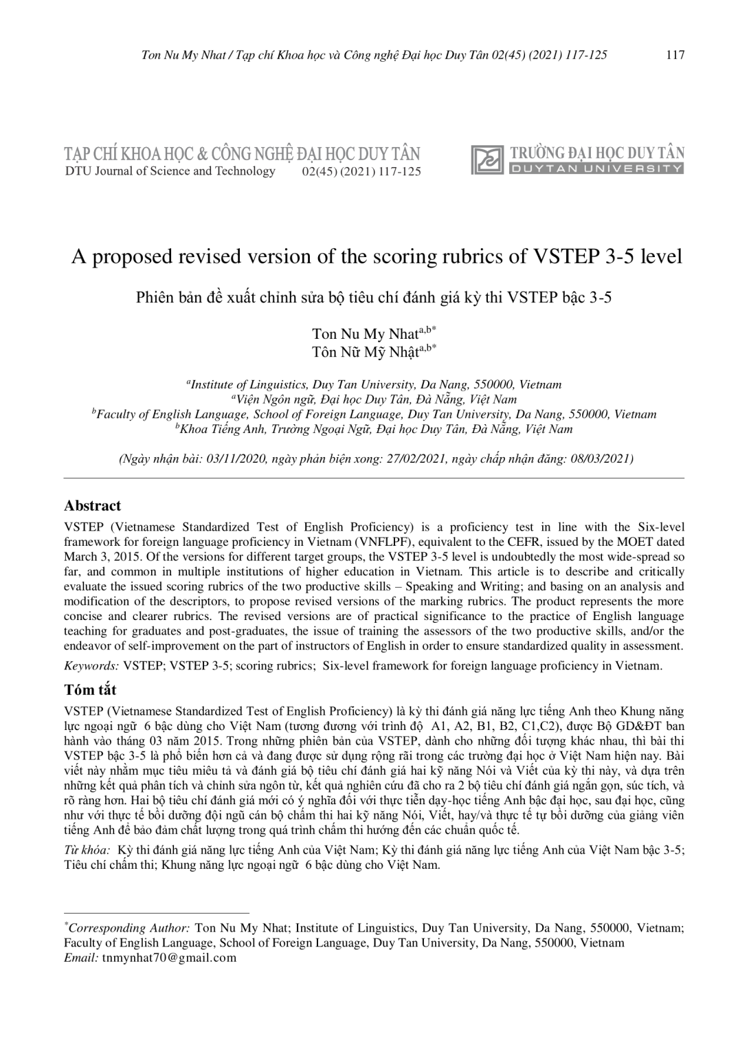 VSTEP (Vietnamese Standardized Test of English Proficiency) là kỳ thi đánh giá năng lực tiếng Anh theo Khung năng lực ngoại ngữ 6 bậc dùng cho Việt Nam (tương đương với trình độ A1, A2, B1, B2, C1,C2), được Bộ GD&ĐT ban hành vào tháng 03 năm 2015. Trong những phiên bản của VSTEP, dành cho những đối tượng khác nhau, thì bài thi VSTEP bậc 3-5 là phổ biến hơn cả và đang được sử dụng rộng rãi trong các trường đại học ở Việt Nam hiện nay. Bài viết này nhằm mục tiêu miêu tả và đánh giá bộ tiêu chí đánh giá hai kỹ năng Nói và Viết của kỳ thi này, và dựa trên những kết quả phân tích và chỉnh sửa ngôn từ, kết quả nghiên cứu đã cho ra 2 bộ tiêu chí đánh giá ngắn gọn, súc tích, và rõ ràng hơn. Hai bộ tiêu chí đánh giá mới có ý nghĩa đối với thực tiễn dạy-học tiếng Anh bậc đại học, sau đại học, cũng như với thực tế bồi dưỡng đội ngũ cán bộ chấm thi hai kỹ năng Nói, Viết, hay/và thực tế tự bồi dưỡng của giảng viên tiếng Anh để bảo đảm chất lượng trong quá trình chấm thi hướng đến các chuẩn quốc tế.