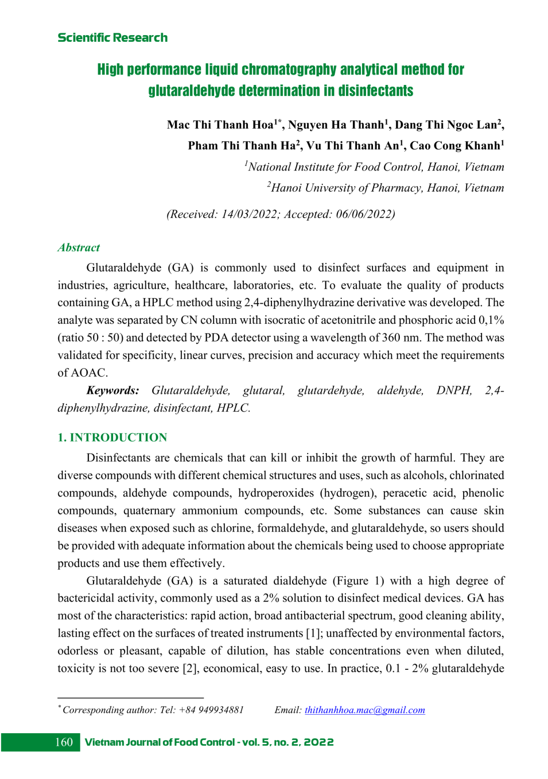 Glutaraldehyd (GA) là một hoạt chất được sử dụng phổ biến để khử trùng và sát khuẩn bề mặt và thiết bị trong công nghiệp, nông nghiệp, y tế, phòng thí nghiệm,... Nhằm đánh giá chất lượng các chế phẩm chứa GA trên thị trường, phương pháp xác định GA bằng cách dẫn xuất với thuốc thử 2,4-dinitrophenylhydrazin (DNPH) đã được xây dựng. Chất phân tích được tách sắc ký bằng cột CN với pha động đẳng dòng gồm acetonitrile và acid phosphoric 0,1% (tỷ lệ 50 : 50) và xác định bằng detector PDA ở bước sóng 360 nm. Phương pháp đã được thẩm định độ đăc hiệu, đường chuẩn, độ đúng và độ chụm đạt yêu cầu của AOAC.