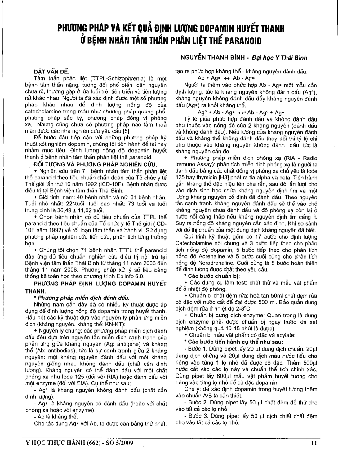 Phương pháp và kết quả định lượng Dopamin huyết thanh ở bệnh nhân tâm thần phân liệt thể Paranoid