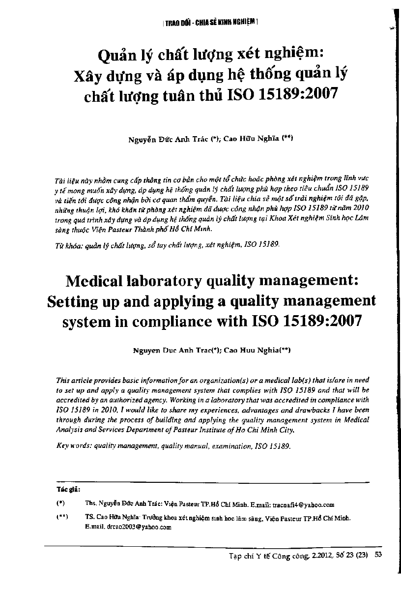 Quản lý chất lượng xét nghiệm" Xây dựng và áp dụng hệ thống quản lý chất lượng tuân thủ ISO 15189:2007