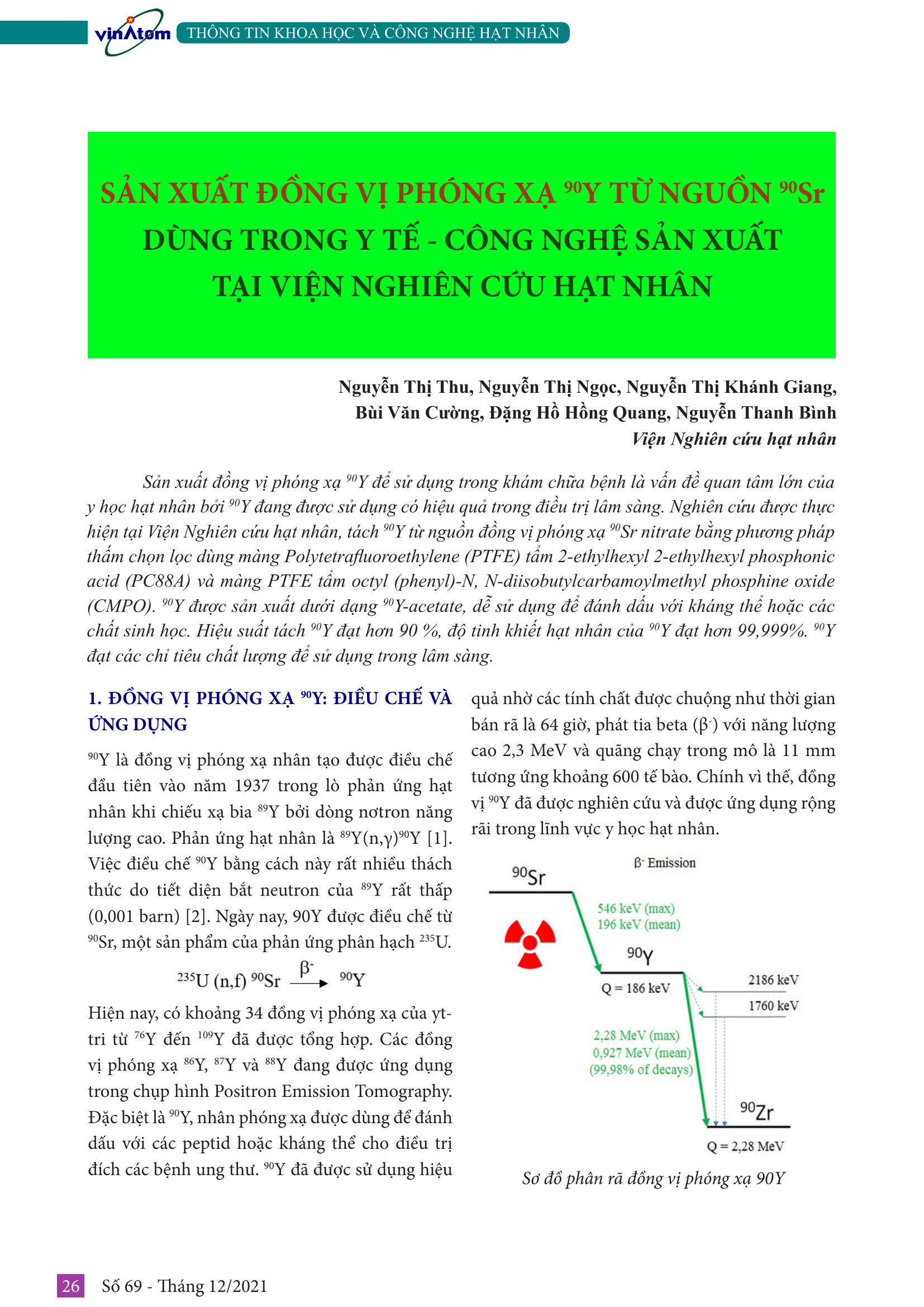 Sản xuất đồng vị phóng xạ 90Y để sử dụng trong khám chữa bệnh là vấn đề quan tâm lớn của y học hạt nhân bởi 90Y đang được sử dụng có hiệu quả trong điều trị lâm sàng. Nghiên cứu được thực hiện tại Viện Nghiên cứu hạt nhân, tách 90Y từ nguồn đồng vị phóng xạ 90Sr nitrate bằng phương pháp thấm chọn lọc dùng màng Polytetrafluoroethylene (PTFE) tẩm 2-ethylhexyl 2-ethylhexyl phosphonic acid (PC88A) và màng PTFE tẩm octyl (phenyl)-N, N-diisobutylcarbamoylmethyl phosphine oxide (CMPO). 90Y được sản xuất dưới dạng 90Y-acetate, dễ sử dụng để đánh dấu với kháng thể hoặc các chất sinh học. Hiệu suất tách 90Y đạt hơn 90 %, độ tinh khiết hạt nhân của 90Y đạt hơn 99,999%. 90Y đạt các chỉ tiêu chất lượng để sử dụng trong lâm sàng.