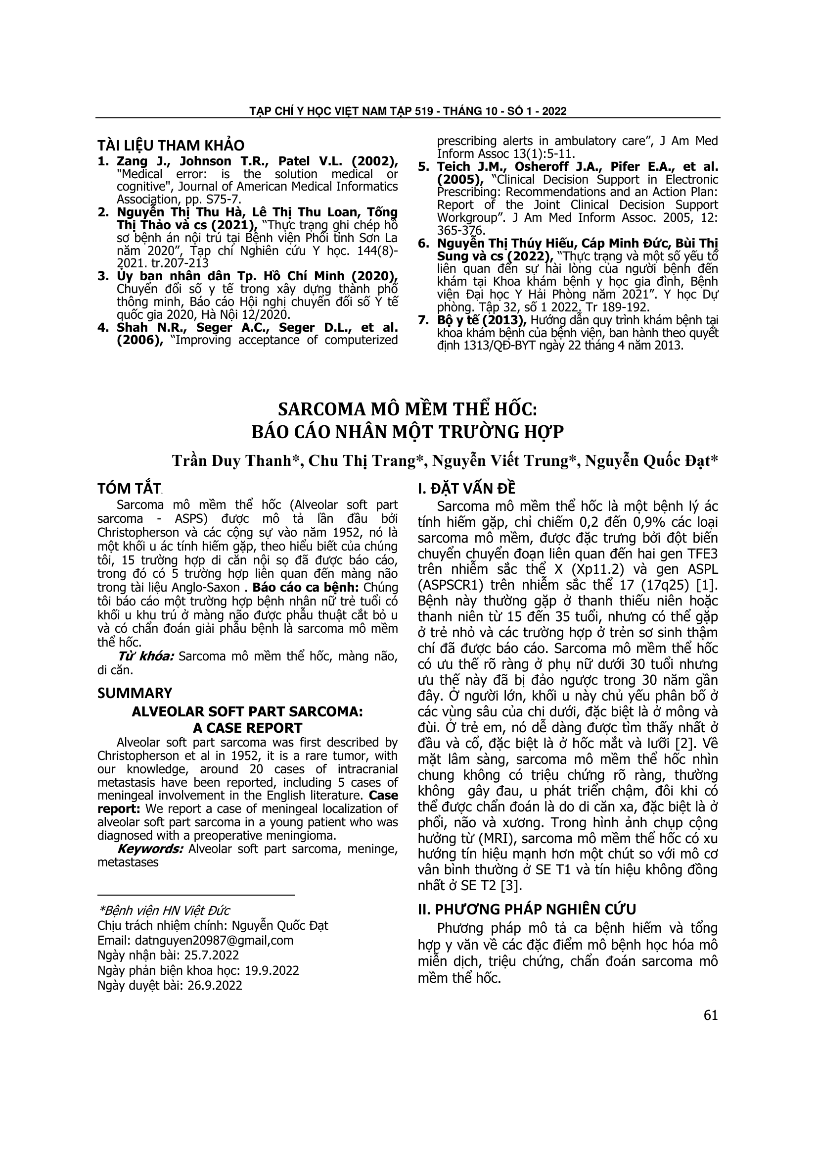 Sarcoma mô mềm thể hốc (Alveolar soft part sarcoma - ASPS) được mô tả lần đầu bởi Christopherson và các cộng sự vào năm 1952, nó là một khối u ác tính hiếm gặp, theo hiểu biết của chúng tôi, 15 trường hợp di căn nội sọ đã được báo cáo, trong đó có 5 trường hợp liên quan đến màng não trong tài liệu Anglo-Saxon . Báo cáo ca bệnh: Chúng tôi báo cáo một trường hợp bệnh nhân nữ trẻ tuổi có khối u khu trú ở màng não được phẫu thuật cắt bỏ u và có chẩn đoán giải phẫu bệnh là sarcoma mô mềm thể hốc.