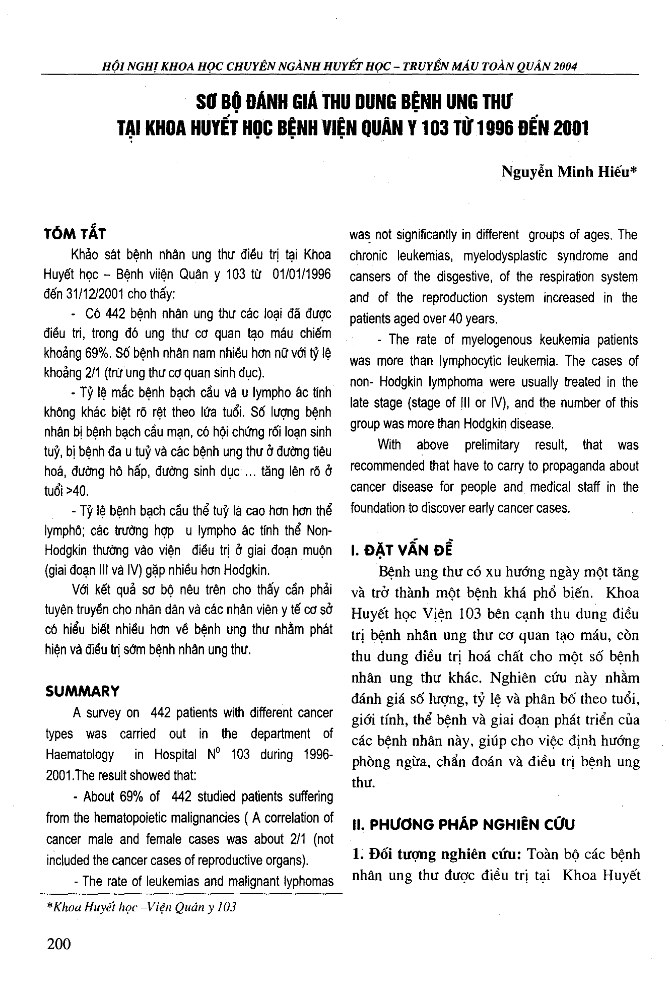 Khảo sát bệnh nhân ung thư điều trị tại khoa huyết học-Bệnh viện quân y 103 từ 1/1/1996-31/12/2001. Có 442 bệnh nhân ung thư các loại đã được điều trị, trong đó ung thư cơ quan tạo máu chiếm khoảng 69% . Số bệnh nhân nam nhiều hơn nữ với tỷ lệ 2/1. Tỷ lệ mắc bệnh bạch cầu và u lympho ác tính không khác biệt rõ rệt theo lứa tuổi. Số lượng bệnh nhân bị bệnh bạch cầu mạn, có hội chứng rối loạn sinh tuỷ, bị bệnh đa u tuỷ và các bệnh ung thư ở đường tiêu hoá, đường hô hấp, đường sinh dục,... tăng lên rõ ở tuổi trên 40. Tỷ lệ bệnh bạch cầu thể tuỷ cao hơn thể lympho; các trường hợp u lympho ác tính thể Non-Hodgkin thường vào viện điều trị ở giai đoạn muộn gặp nhiều hơn Hodgkin.