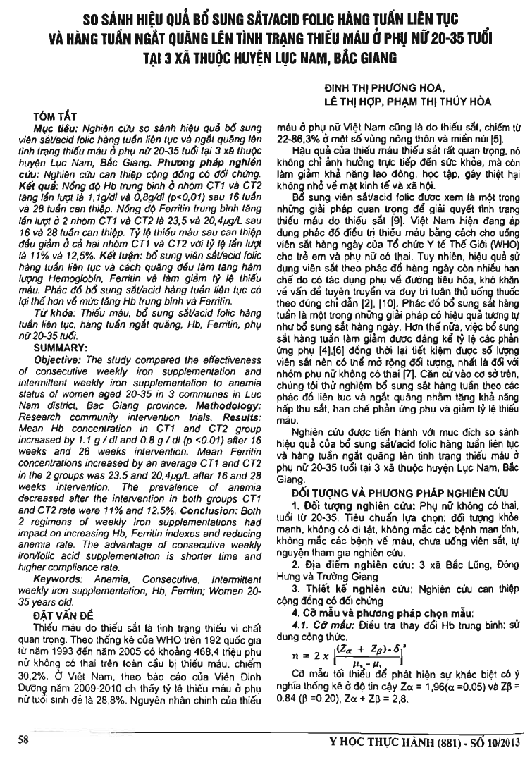 Objective: The study compared the effectiveness of consecutive weekly iron supplementation and intermittent weekly iron supplementation to anemia status of women aged 20-35 in 3 communes in Luc Nam district, Bac Giang province. Methodology: Research community intervention trials. Results: Mean Hb concentration in cn and CT2 group increased by 1.1 g / dl and 0.8 g / dl (p 0.01) after 16 weeks and 28 weeks intervention. Mean Ferritin concentrations increased by an average cn and CT2 in the 2 groups was 23.5 and 20.4 ug/L after 16 and 28 weeks intervention. The prevalence of anemia decreased after the intervention in both groups cn and CT2 rate were 11 percent and 12.5 percent. Conclusion: Both 2 regimens of weekly iron supplementations had impact on increasing Hb, Ferritin indexes and reducing anemia rate. The advantage of consecutive weekly iron/folic acid supplementation is shorter time and higher compliance rate.