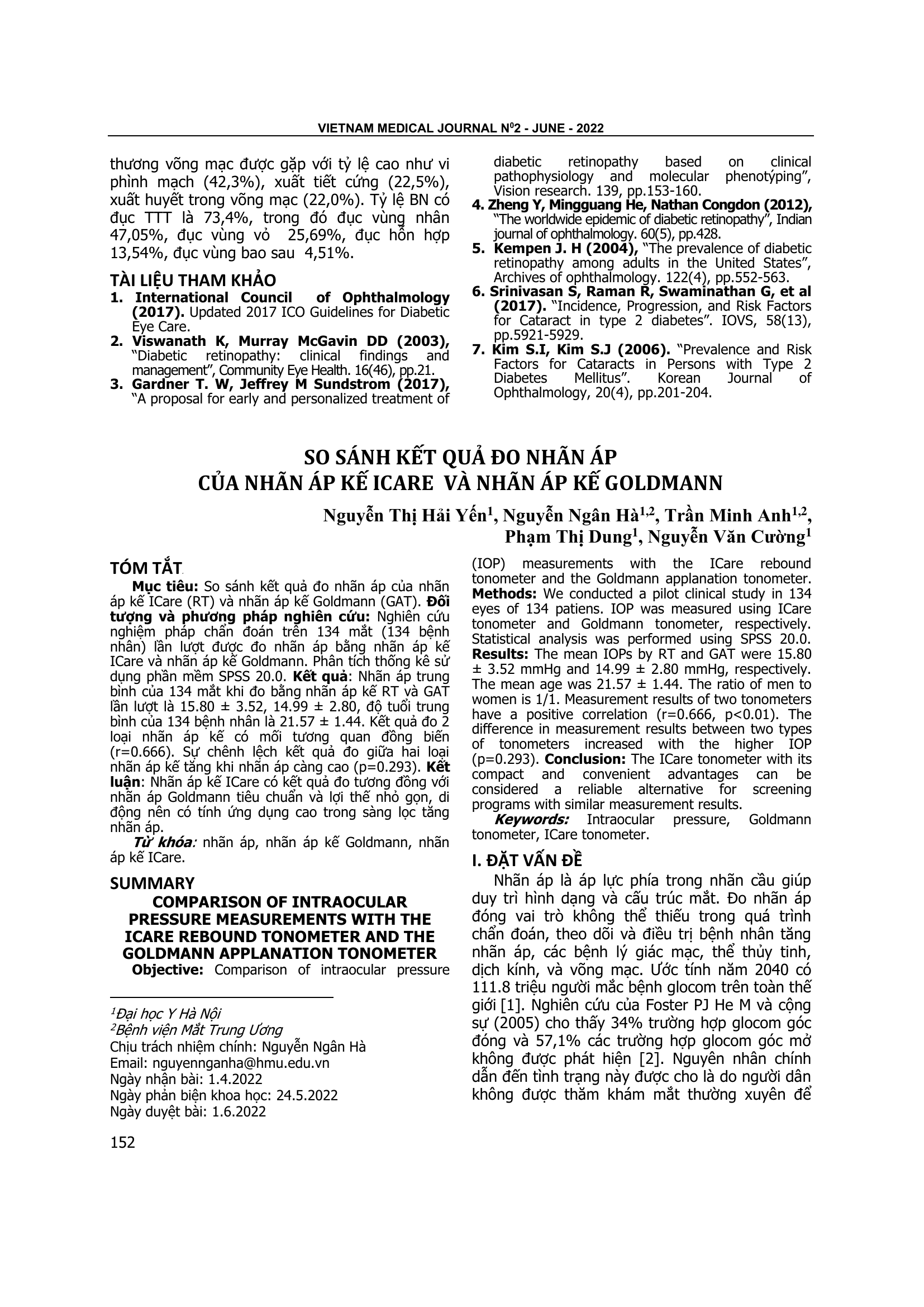 So sánh kết quả đo nhãn áp của nhãn áp kế ICare (RT) và nhãn áp kế Goldmann (GAT). Đối tượng và phương pháp nghiên cứu: Nghiên cứu nghiệm pháp chẩn đoán trên 134 mắt (134 bệnh nhân) lần lượt được đo nhãn áp bằng nhãn áp kế ICare và nhãn áp kế Goldmann. Phân tích thống kê sử dụng phần mềm SPSS 20.0. Kết quả: Nhãn áp trung bình của 134 mắt khi đo bằng nhãn áp kế RT và GAT lần lượt là 15.80 ± 3.52, 14.99 ± 2.80, độ tuổi trung bình của 134 bệnh nhân là 21.57 ± 1.44. Kết quả đo 2 loại nhãn áp kế có mối tương quan đồng biến (r=0.666). Sự chênh lệch kết quả đo giữa hai loại nhãn áp kế tăng khi nhãn áp càng cao (p=0.293). Kết luận: Nhãn áp kế ICare có kết quả đo tương đồng với nhãn áp Goldmann tiêu chuẩn và lợi thế nhỏ gọn, di động nên có tính ứng dụng cao trong sàng lọc tăng nhãn áp.