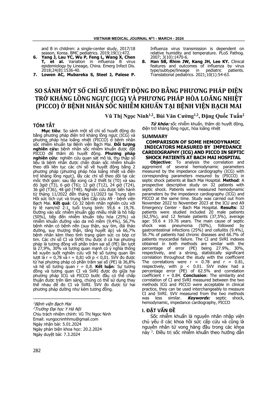 So sánh một số chỉ số huyết động đo bằng phương pháp điện trở kháng lồng ngực (ICG) và phương pháp hòa loãng nhiệt (PICCO) ở bệnh nhân sốc nhiễm khuẩn tại Bệnh viện Bạch Mai. Đối tượng nghiên cứu: bệnh nhân sốc nhiễm khuẩn được đặt PICCO để thăm dò huyết động. Phương pháp nghiên cứu: nghiên cứu quan sát mô tả, thu thập số liệu là bệnh nhân được chẩn đoán sốc nhiễm khuẩn theo dõi liên tục các chỉ số về huyết động bằng 2 phương pháp (phương pháp hòa loãng nhiệt và điện trở kháng lồng ngực), lấy các chỉ số theo dõi tại các mốc thời gian: sau lắp xong cả 2 thiết bị (T0) và sau đó 3giờ (T3), 6 giờ (T6); 12 giờ (T12), 24 giờ (T24), 36 giờ (T36), 48 giờ (T48). Nghiên cứu được tiến hành từ tháng 11/2022 đến tháng 11/2023 tại Trung tâm Hồi sức tích cực và trung tâm Cấp cứu A9 - bệnh viện Bạch Mai. Kết quả: Có 32 bệnh nhân nghiên cứu với tỷ lệ nam/nữ 2:1, tuổi trung bình: 59,6 ± 19,76. Đường vào sốc nhiễm khuẩn gặp nhiều nhất là hô hấp (50%), tiếp đến nhiễm khuẩn tiêu hóa (25%) và nhiễm khuẩn đường vào da mô mềm (9,4%), 56,7% bệnh nhân có bệnh nền (suy thận, suy tim, đái tháo đường, suy thượng thận, tăng huyết áp) và 66,7% bệnh nhân kèm theo tình trạng giảm sức co bóp cơ tim. Các chỉ số CI và SVRI thu được ở cả hai phương pháp là tương đồng với phần trăm sai số (PE) lần lượt là 27,9%, 30% và tương quan mạnh có ý nghĩa thống kê xuyên suốt nghiên cứu với hệ số tương quan lần lượt là r = 0,78 và r = 0,81 với p < 0,01. SVV đo được từ hai phương pháp có phần trăm sai số (PE) là 36,8% và hệ số tương quan r = 0,8. Kết luận: Sự tương đồng và tương quan CI và SVRI được đo giữa hai phương pháp ICG và PICCO bước đầu có thể chấp thuận được trên lâm sàng, chúng có thể sử dụng thay thế nhau để đo CI và SVRI. SVV đo được từ hai phương pháp dường như kém tương đồng.