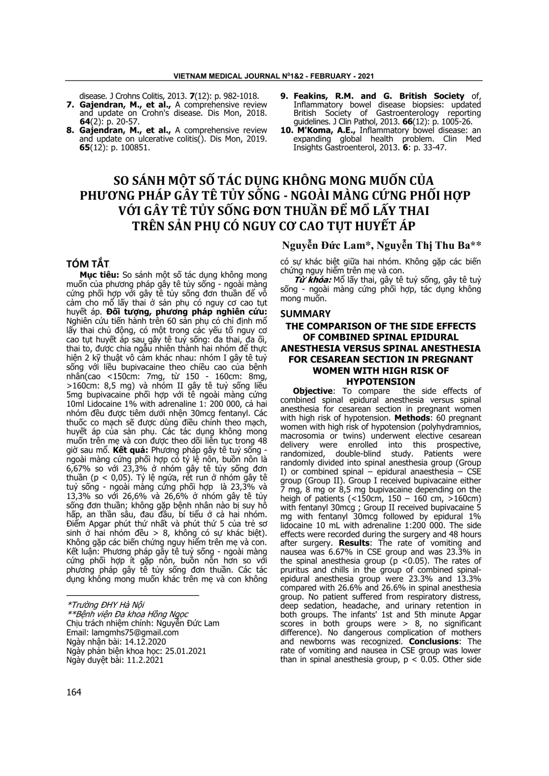 So sánh một số tác dụng không mong muốn của phương pháp gây tê tủy sống - ngoài màng cứng phối hợp với gây tê tủy sống đơn thuần để vô cảm cho mổ lấy thai ở sản phụ có nguy cơ cao tụt huyết áp. Đối tượng, phương pháp nghiên cứu Nghiên cứu tiến hành trên 60 sản phụ có chỉ định mổ lấy thai chủ động, có một trong các yếu tố nguy cơ cao tụt huyết áp sau gây tê tuỷ sống đa thai, đa ối, thai to, được chia ngẫu nhiên thành hai nhóm để thực hiện 2 kỹ thuật vô cảm khác nhau nhóm I gây tê tuỷ sống với liều bupivacaine theo chiều cao của bệnh nhân(cao <150cm 7mg, từ 150 - 160cm 8mg, >160cm 8,5 mg) và nhóm II gây tê tuỷ sống liều 5mg bupivacaine phối hợp với tê ngoài màng cứng 10ml Lidocaine 1% with adrenaline 1 200 000, cả hai nhóm đều được tiêm dưới nhện 30mcg fentanyl. Các thuốc co mạch sẽ được dùng điều chỉnh theo mạch, huyết áp của sản phụ. Các tác dụng không mong muốn trên mẹ và con được theo dõi liên tục trong 48 giờ sau mổ. Kết quả Phương pháp gây tê tuỷ sống - ngoài màng cứng phối hợp có tỷ lệ nôn, buồn nôn là 6,67% so với 23,3% ở nhóm gây tê tủy sống đơn thuần (p < 0,05). Tỷ lệ ngứa, rét run ở nhóm gây tê tuỷ sống - ngoài màng cứng phối hợp là 23,3% và 13,3% so với 26,6% và 26,6% ở nhóm gây tê tủy sống đơn thuần; không gặp bệnh nhân nào bị suy hô hấp, an thần sâu, đau đầu, bí tiểu ở cả hai nhóm. Điểm Apgar phút thứ nhất và phút thứ 5 của trẻ sơ sinh ở hai nhóm đều > 8, không có sự khác biệt). Không gặp các biến chứng nguy hiểm trên mẹ và con. Kết luận Phương pháp gây tê tuỷ sống - ngoài màng cứng phối hợp ít gặp nôn, buồn nôn hơn so với phương pháp gây tê tủy sống đơn thuần. Các tác dụng không mong muốn khác trên mẹ và con không có sự khác biệt giữa hai nhóm. Không gặp các biến chứng nguy hiểm trên mẹ và con.