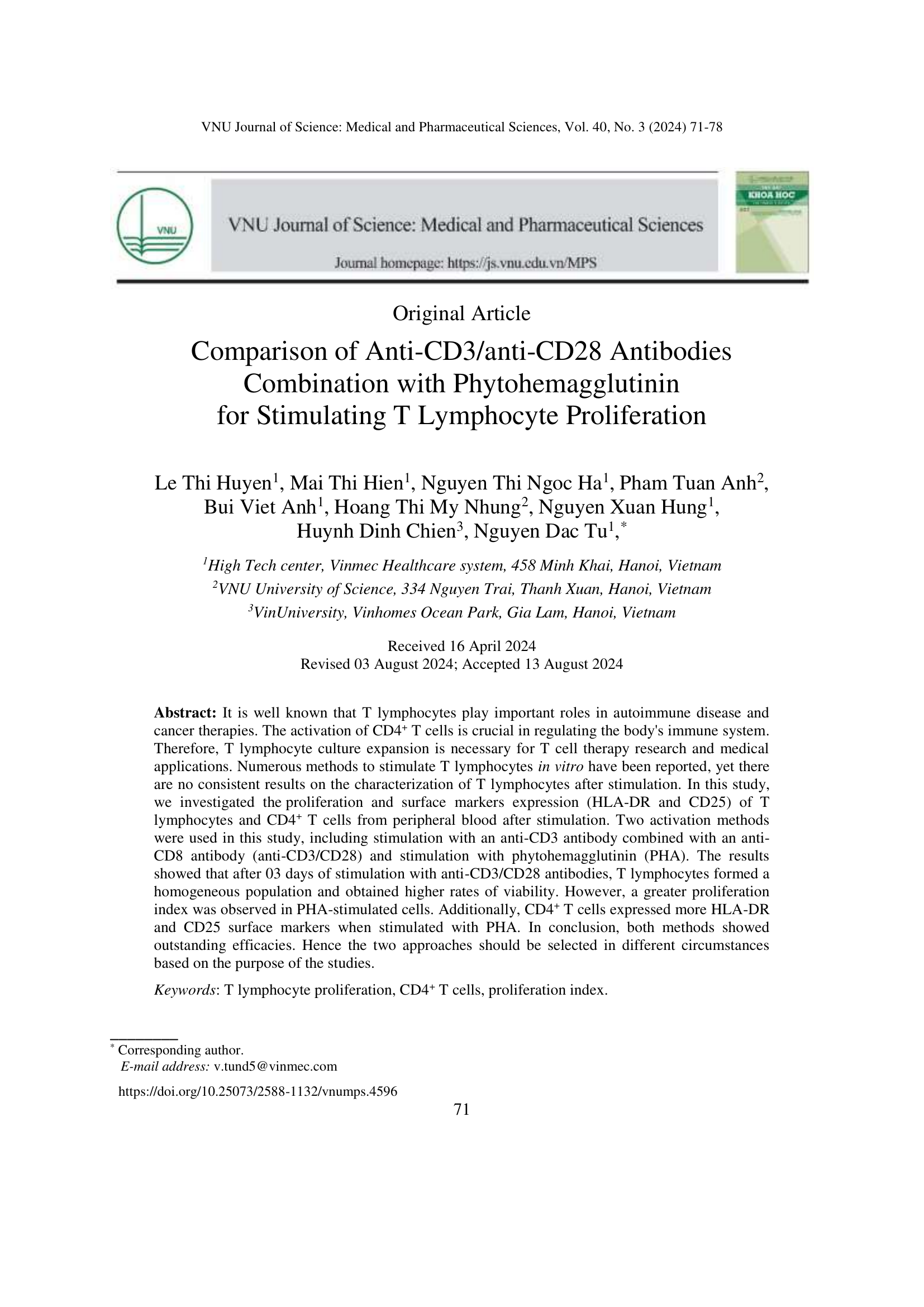 Tế bào lympho T chiếm một vai trò quan trọng trong các liệu pháp điều trị bệnh tự miễn và ung thư. Trong đó, tế bào TCD4+ đóng vai trò hết sức quan trọng trong việc điều hòa hệ thống miễn dịch của cơ thể. Do đó, nuôi cấy và tăng sinh số lượng lớn tế bào lympho T in vitro cũng như tế bào TCD4+ là cần thiết cho các nghiên cứu ứng dụng liệu pháp tế bào T. Nhiều phương pháp khác nhau đã được phát triển để kích thích tăng sinh tế bào lympho T, tuy nhiên, các báo cáo đánh giá đặc điểm của tế bào sau khi được kích thích chưa được chú trọng. Trong nghiên cứu này, chúng tôi khảo sát ảnh hưởng của hai phương pháp: kích thích bằng kháng thể kháng CD3 hết hợp với kháng thể kháng CD8 (CD3/CD28) và Phytohemagglutinin PHA lên sự tăng sinh cũng như mức độ biểu hiện dấu ấn bề mặt HLA-DR, CD25 của quần thể tế bào lympho T và tế bào TCD4+ có trong mẫu PBMC. Kết quả nghiên cứu cho thấy dưới sự kích thích bằng kháng thể kháng CD3/CD28, quần thể tế bào lympho T đồng nhất và đạt tỷ lệ sống tốt hơn sau 03 ngày đầu nuôi cấy. Tuy nhiên, có sự chênh lệch nhiều hơn đáng kể về tỷ lệ tăng sinh qua các thế hệ giữa phương pháp kích thích bằng PHA so với kháng thể kháng CD3/CD28, cũng như biểu hiện các dấu ấn bề mặt HLA-DR, CD25 trên tế bào TCD4+. Cả hai phương pháp đều có những hiệu quả nổi bật riêng biệt, tùy thuộc vào mục đích nghiên cứu để lựa chọn yếu tố kích thích tăng sinh tế bào lympho T phù hợp.