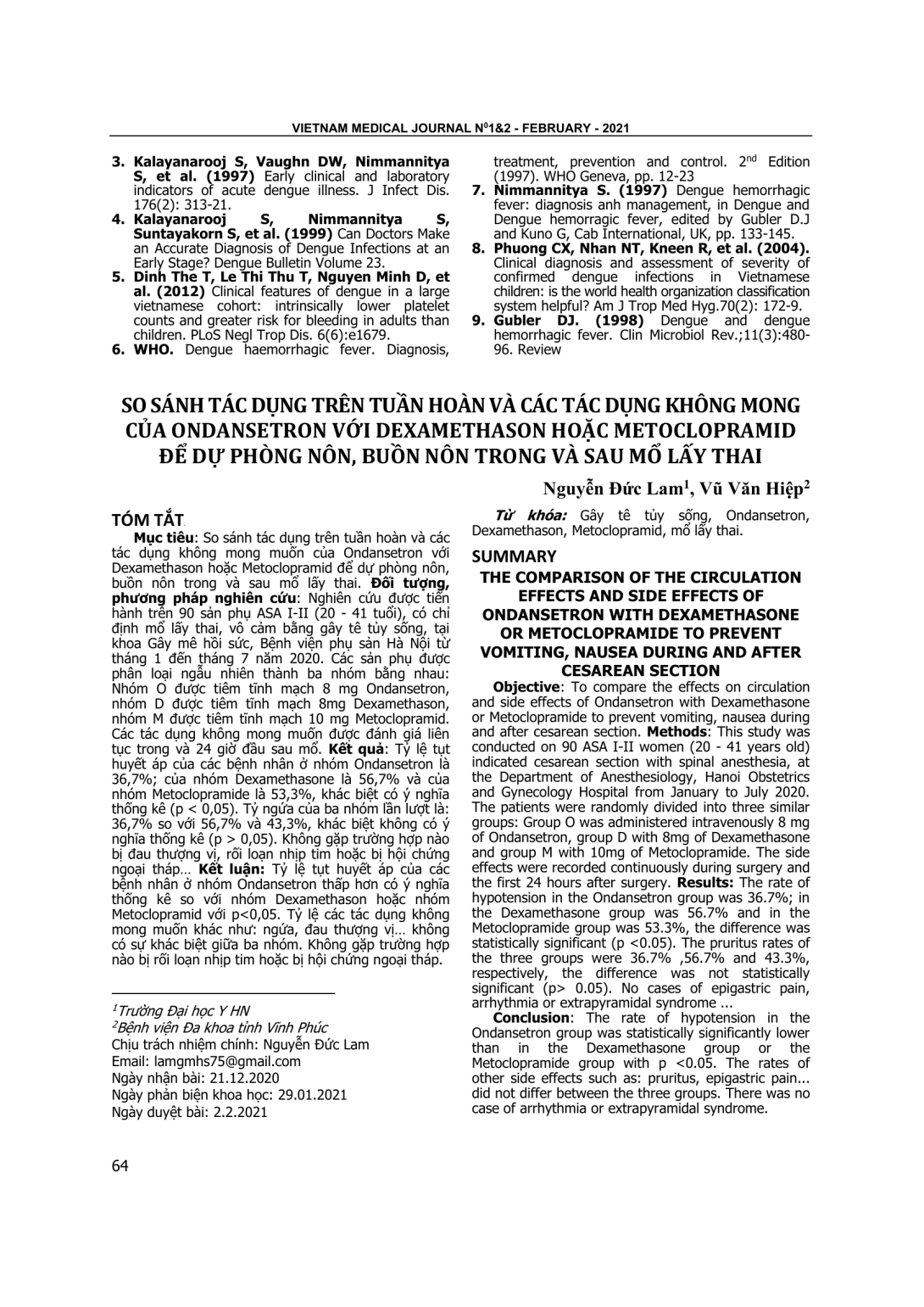 So sánh tác dụng trên tuần hoàn và các tác dụng không mong muốn của Ondansetron với Dexamethason hoặc Metoclopramid để dự phòng nôn, buồn nôn trong và sau mổ lấy thai. Đối tượng, phương pháp nghiên cứu: Nghiên cứu được tiến hành trên 90 sản phụ ASA I-II (20 - 41 tuổi), có chỉ định mổ lấy thai, vô cảm bằng gây tê tủy sống, tại khoa Gây mê hồi sức, Bệnh viện phụ sản Hà Nội từ tháng 1 đến tháng 7 năm 2020. Các sản phụ được phân loại ngẫu nhiên thành ba nhóm bằng nhau: Nhóm O được tiêm tĩnh mạch 8 mg Ondansetron, nhóm D được tiêm tĩnh mạch 8mg Dexamethason, nhóm M được tiêm tĩnh mạch 10 mg Metoclopramid. Các tác dụng không mong muốn được đánh giá liên tục trong và 24 giờ đầu sau mổ. Kết quả: Tỷ lệ tụt huyết áp của các bệnh nhân ở nhóm Ondansetron là 36,7%; của nhóm Dexamethasone là 56,7% và của nhóm Metoclopramide là 53,3%, khác biệt có ý nghĩa thống kê (p < 0,05). Tỷ ngứa của ba nhóm lần lượt là: 36,7% so với 56,7% và 43,3%, khác biệt không có ý nghĩa thống kê (p > 0,05). Không gặp trường hợp nào bị đau thượng vị, rối loạn nhịp tim hoặc bị hội chứng ngoại tháp… Kết luận: Tỷ lệ tụt huyết áp của các bệnh nhân ở nhóm Ondansetron thấp hơn có ý nghĩa thống kê so với nhóm Dexamethason hoặc nhóm Metoclopramid với p<0,05. Tỷ lệ các tác dụng không mong muốn khác như: ngứa, đau thượng vị… không có sự khác biệt giữa ba nhóm. Không gặp trường hợp nào bị rối loạn nhịp tim hoặc bị hội chứng ngoại tháp.