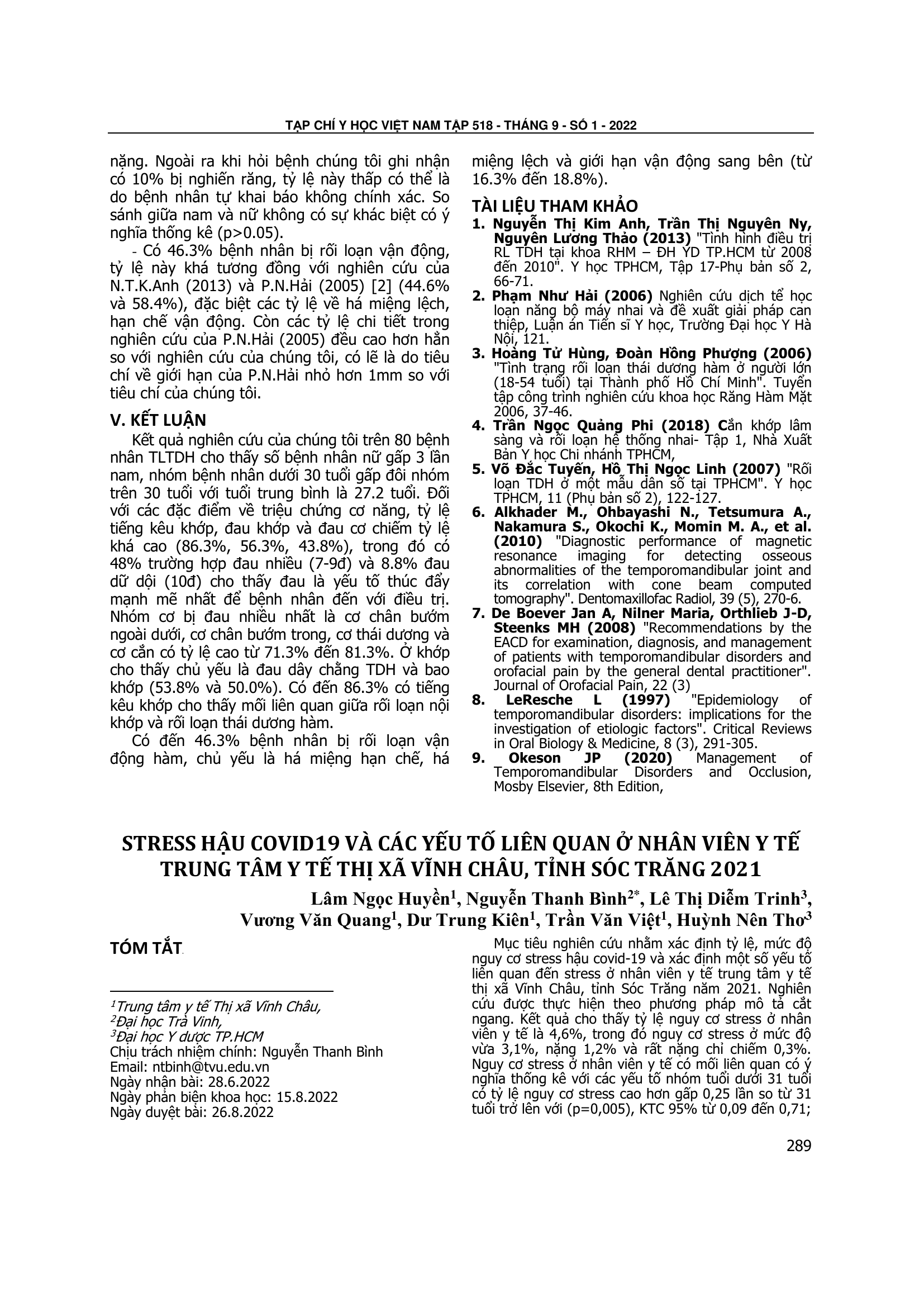 Xác định tỷ lệ, mức độ nguy cơ stress hậu covid-19 và xác định một số yếu tố liên quan đến stress ở nhân viên y tế trung tâm y tế thị xã Vĩnh Châu, tỉnh Sóc Trăng năm 2021. Nghiên cứu được thực hiện theo phương pháp mô tả cắt ngang. Kết quả cho thấy tỷ lệ nguy cơ stress ở nhân viên y tế là 4,6%, trong đó nguy cơ stress ở mức độ vừa 3,1%, nặng 1,2% và rất nặng chỉ chiếm 0,3%. Nguy cơ stress ở nhân viên y tế có mối liên quan có ý nghĩa thống kê với các yếu tố nhóm tuổi dưới 31 tuổi có tỷ lệ nguy cơ stress cao hơn gấp 0,25 lần so từ 31 tuổi trở lên với (p=0,005), KTC 95% từ 0,09 đến 0,71; nhân viên thuê nhà ở có tỷ lệ nguy cơ stress cao hơn gấp 3,89 lần so với nhóm còn lại với (p=0,008), KTC 95% từ 1,42 đến 10,65; yếu tố cảm thấy khối lượng công việc nhiều có tỷ lệ nguy cơ stress cao hơn gấp 3,14 lần so với nhóm còn lại với (p=0,022), KTC 95% từ 1,15 đến 8,6; nhân viên cảm thấy công việc có mức độ nguy hiểm cao có tỷ lệ nguy cơ stress cao gấp 5,78 lần so với nhóm còn lại với (p = 0,037), KTC 95% từ 0,77 đến 43,36. Song song đó phân tích hồi quy đa biến ghi nhận, chỉ có yếu tố nhóm tuổi có mối liên quan thực sự đến mức độ nguy cơ stress ở nhân viên y tế.