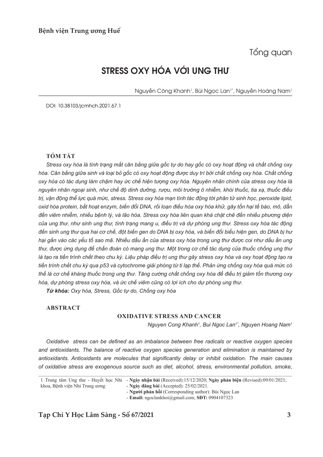 Stress oxy hóa là tình trạng mất cân bằng giữa gốc tự do hay gốc có oxy hoạt động và chất chống oxy hóa. Cân bằng giữa sinh và loại bỏ gốc có oxy hoạt động được duy trì bởi chất chống oxy hóa. Chất chống oxy hóa có tác dụng làm chậm hay ức chế hiện tượng oxy hóa. Nguyên nhân chính của stress oxy hóa là nguyên nhân ngoại sinh, như chế độ dinh dưỡng, rượu, môi trường ô nhiễm, khói thuốc, tia xạ, thuốc điều trị, vận động thể lực quá mức, stress. Stress oxy hóa mạn tính tác động tới phân tử sinh học, peroxide lipid, oxid hóa protein, bất hoạt enzym, biến đổi DNA, rối loạn điều hòa oxy hóa khử, gây tổn hại tế bào, mô, dẫn đến viêm nhiễm, nhiều bệnh lý, và lão hóa. Stress oxy hóa liên quan khá chặt chẽ đến nhiều phương diện của ung thư, như sinh ung thư, tình trạng mang u, điều trị và dự phòng ung thư. Stress oxy hóa tác động đến sinh ung thư qua hai cơ chế, đột biến gen do DNA bị oxy hóa, và biến đổi biểu hiện gen, do DNA bị hư hại gắn vào các yếu tố sao mã. Nhiều dấu ấn của stress oxy hóa trong ung thư được coi như dấu ấn ung thư, được ứng dụng để chẩn đoán có mang ung thư. Một trong cơ chế tác dụng của thuốc chống ung thư là tạo ra tiến trình chết theo chu kỳ. Liệu pháp điều trị ung thư gây stress oxy hóa và oxy hoạt động tạo ra tiến trình chết chu kỳ qua p53 và cytochrome giải phóng từ ti lạp thể. Phản ứng chống oxy hóa quá mức có thể là cơ chế kháng thuốc trong ung thư. Tăng cường chất chống oxy hóa để điều trị giảm tổn thương oxy hóa, dự phòng stress oxy hóa, và ức chế viêm cũng có lợi ích cho dự phòng ung thư.