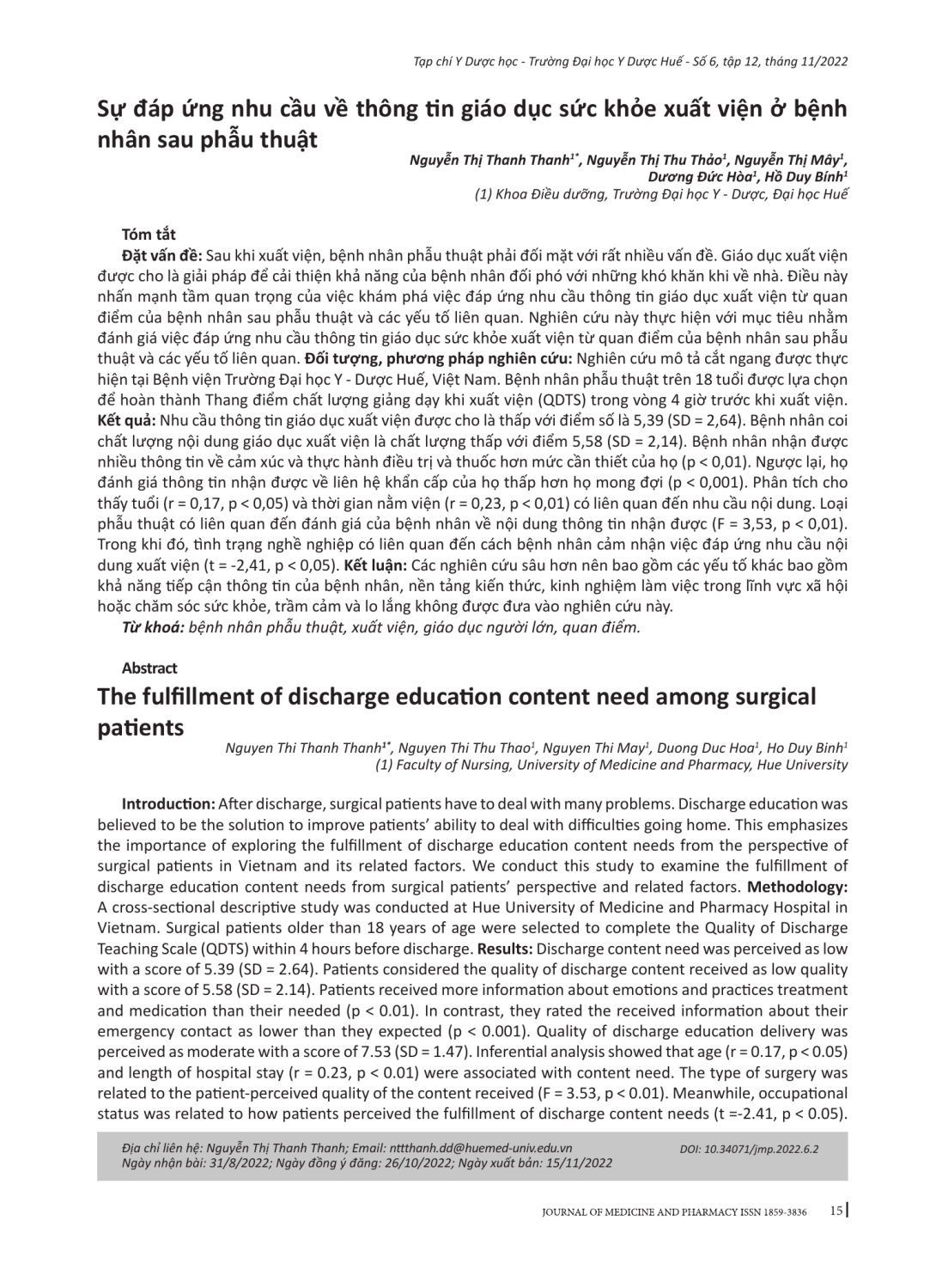 Đánh giá việc đáp ứng nhu cầu thông tin giáo dục sức khỏe xuất viện từ quan điểm của bệnh nhân sau phẫu thuật và các yếu tố liên quan. Đối tượng, phương pháp nghiên cứu: Nghiên cứu mô tả cắt ngang được thực hiện tại Bệnh viện Trường Đại học Y - Dược Huế, Việt Nam. Bệnh nhân phẫu thuật trên 18 tuổi được lựa chọn để hoàn thành Thang điểm chất lượng giảng dạy khi xuất viện (QDTS) trong vòng 4 giờ trước khi xuất viện. Kết quả: Nhu cầu thông tin giáo dục xuất viện được cho là thấp với điểm số là 5,39 (SD = 2,64). Bệnh nhân coi chất lượng nội dung giáo dục xuất viện là chất lượng thấp với điểm 5,58 (SD = 2,14). Bệnh nhân nhận được nhiều thông tin về cảm xúc và thực hành điều trị và thuốc hơn mức cần thiết của họ (p < 0,01). Ngược lại, họ đánh giá thông tin nhận được về liên hệ khẩn cấp của họ thấp hơn họ mong đợi (p < 0,001). Phân tích cho thấy tuổi (r = 0,17, p < 0,05) và thời gian nằm viện (r = 0,23, p < 0,01) có liên quan đến nhu cầu nội dung. Loại phẫu thuật có liên quan đến đánh giá của bệnh nhân về nội dung thông tin nhận được (F = 3,53, p < 0,01). Trong khi đó, tình trạng nghề nghiệp có liên quan đến cách bệnh nhân cảm nhận việc đáp ứng nhu cầu nội dung xuất viện (t = -2,41, p < 0,05). Kết luận: Các nghiên cứu sâu hơn nên bao gồm các yếu tố khác bao gồm khả năng tiếp cận thông tin của bệnh nhân, nền tảng kiến thức, kinh nghiệm làm việc trong lĩnh vực xã hội hoặc chăm sóc sức khỏe, trầm cảm và lo lắng không được đưa vào nghiên cứu này.