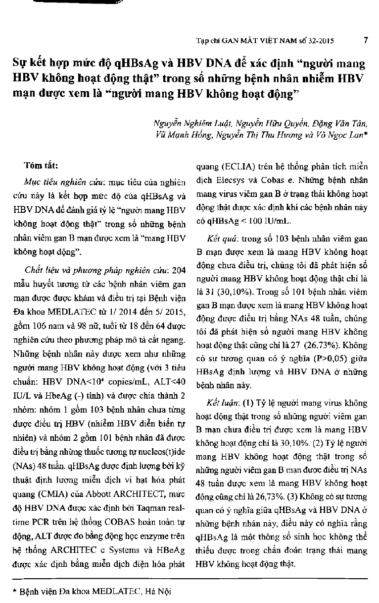 Objectives: the goal of this study is to combine of qHBsAg and HBV DNA levels for determining the true inactive carriers among the chronic HBV infected patients considered as inactive carriers. Materials and methods: 204 plasma samples from the chronic HBV infected patients who were examined and treated in MEDLATEC General Hospital from 2014 Jan-2014 May, consisting 106 males and 98 females, with ages of 18 to 64 years, were included in this cross-sectional study. They were considered as inactive carriers (with 3 criteria: HBV DNA 10 exponent 4 copies/mL, ALT 40 IU/L, and HBeAg negative), and were classified into 2 groups: group 1 consisting 103 treatment-naive patients (natural history) and group 2 consisting 101 patients were treated with nucleotide analogues (NAs) for 48 weeks. Plasma HBsAg were quantified by a chemiluminescent microparticle immunoassay (CMIA) of the Abbott ARCHI-TECT, HBV DNA load was determined by Taq-man real-time PCR using the fully automated COBAS, ALT activities were measured by enzyme kinetic on ARCHITECT c Systems, and HBeAg states were detemined by electrochimilu-minescence (ECLIA) on Elecsys and Cobas e immunoassay analyzer. True inactive carriers were determined when these patients had qHBsAg 100 IU/mL. Results: among 103 treatment-naive patients considered as inactive carriers, only 31 (30.10 percent) true inactive carriers were detected. Among 101 patients who were treated with nucleotide analogues for 48 weeks, considered as inactive carriers, only 27 (26.73 percent) true inactive carriers were detected. No significant correlations (P0.05) between levels of qHBsAg and HBV DNA in these patients. Conclusions: (1) The rate of true inactive carriers among treatment-naive patients considered as inactive carriers was only 30.10 percent. (2) The rate of true inactive carriers among patients treated with nucleotide analogues for 48 weeks who considered as inactive carriers, was only 26.73 percent. (3) There were no significant correlations between qHBsAg and HBV DNA in these patients; this means that qHBsAg was an indispensable biological parameter to diagnose the true inactive virus carrier state.