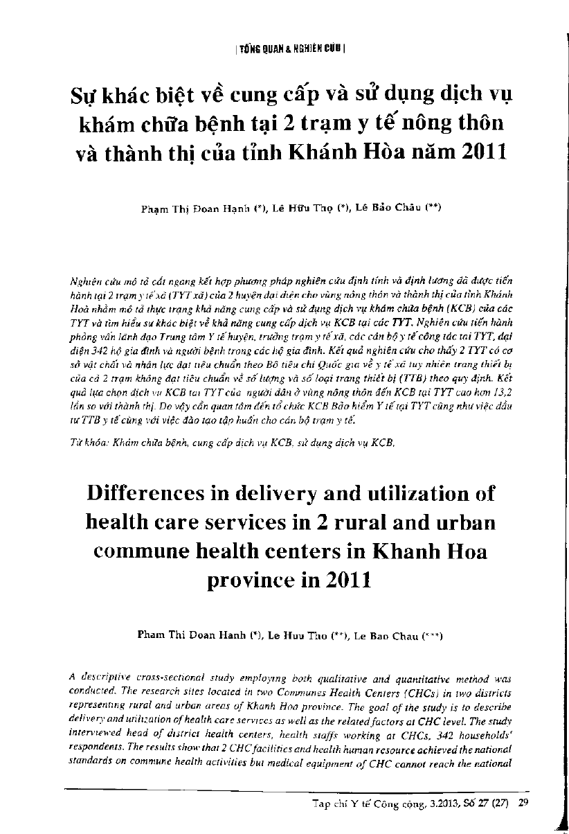 Sự khác biệt về cung cấp và sử dụng dịch vụ khám chữa bệnh tại 2 trạm y tế nông thôn và thành thị của tỉnh Khánh Hòa năm 2011