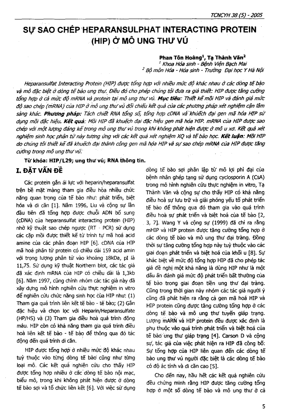 Thiết kế mồi HIP và đánh giá mức độ sao chép (mRNA) của HIP ở mô ung thư vú và đối chiếu với kết quả của các phương pháp xét nghiệm lâm sàng khác. Mồi HIP do nhóm nghiên cứu thiết kế đã khuếch đại đặc hiệu gen mã hóa HIP, mRNA của HIP được sao chép với một lượng đáng kể trong mô ung thư vú. Kết quả xét nghiệm sinh học phân tử tương ứng với các kết quả xét nghiệm XQ và tế bào học.