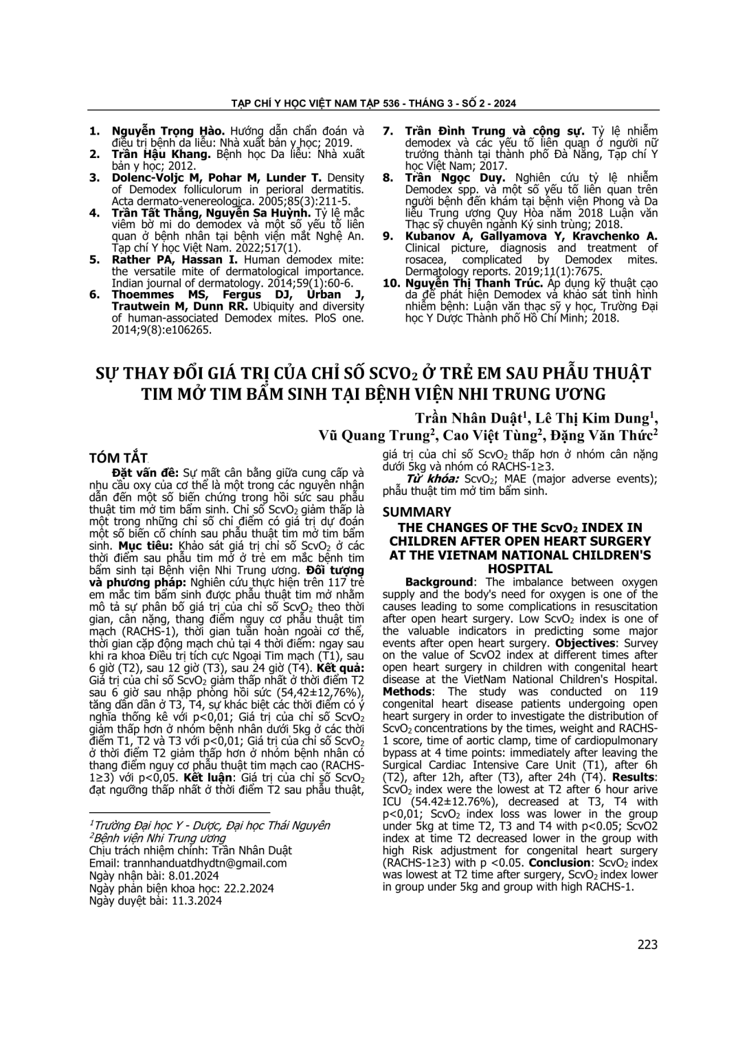Sự thay đổi giá trị của chỉ số ScvO2 ở trẻ em sau phẫu thuật tim mở tim bẩm sinh tại Bệnh viện Nhi Trung ương