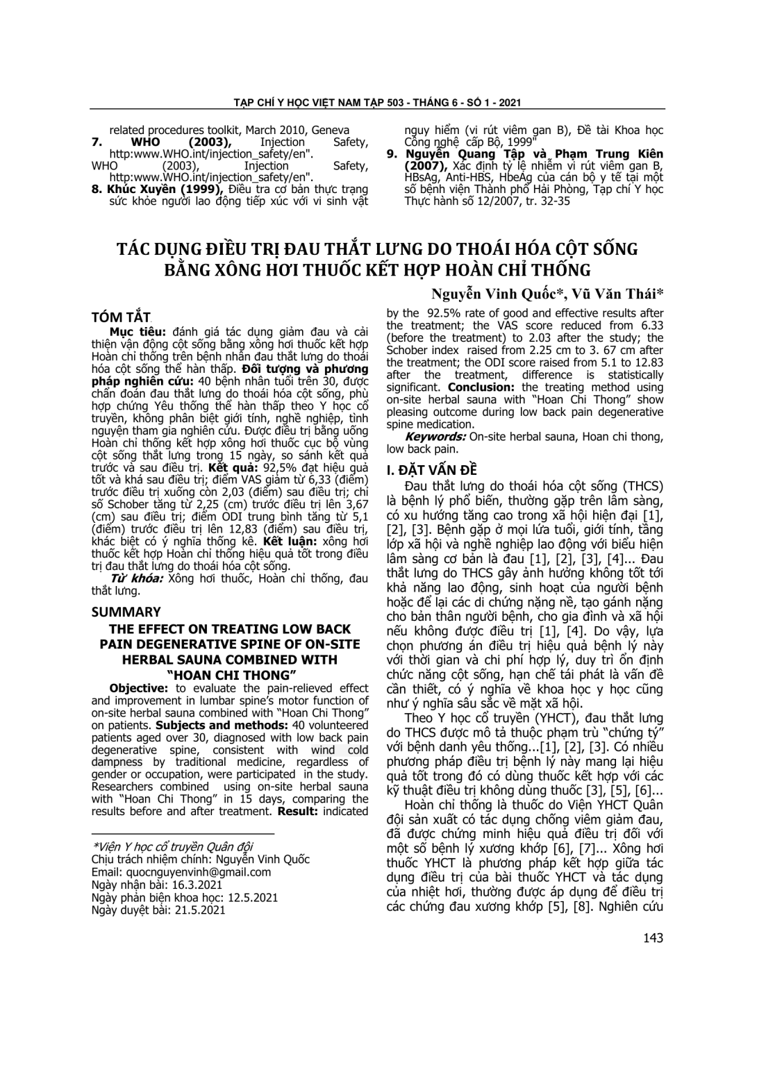 Đánh giá tác dụng giảm đau và cải thiện vận động cột sống bằng xông hơi thuốc kết hợp Hoàn chỉ thống trên bệnh nhân đau thắt lưng do thoái hóa cột sống thể hàn thấp. Đối tượng và phương pháp nghiên cứu 40 bệnh nhân tuổi trên 30, được chẩn đoán đau thắt lưng do thoái hóa cột sống, phù hợp chứng Yêu thống thể hàn thấp theo Y học cổ truyền, không phân biệt giới tính, nghề nghiệp, tình nguyện tham gia nghiên cứu. Được điều trị bằng uống Hoàn chỉ thống kết hợp xông hơi thuốc cục bộ vùng cột sống thắt lưng trong 15 ngày, so sánh kết quả trước và sau điều trị. Kết quả 92,5% đạt hiệu quả tốt và khá sau điều trị; điểm VAS giảm từ 6,33 (điểm) trước điều trị xuống còn 2,03 (điểm) sau điều trị; chỉ số Schober tăng từ 2,25 (cm) trước điều trị lên 3,67 (cm) sau điều trị; điểm ODI trung bình tăng từ 5,1 (điểm) trước điều trị lên 12,83 (điểm) sau điều trị, khác biệt có ý nghĩa thống kê. Kết luận xông hơi thuốc kết hợp Hoàn chỉ thống hiệu quả tốt trong điều trị đau thắt lưng do thoái hóa cột sống.