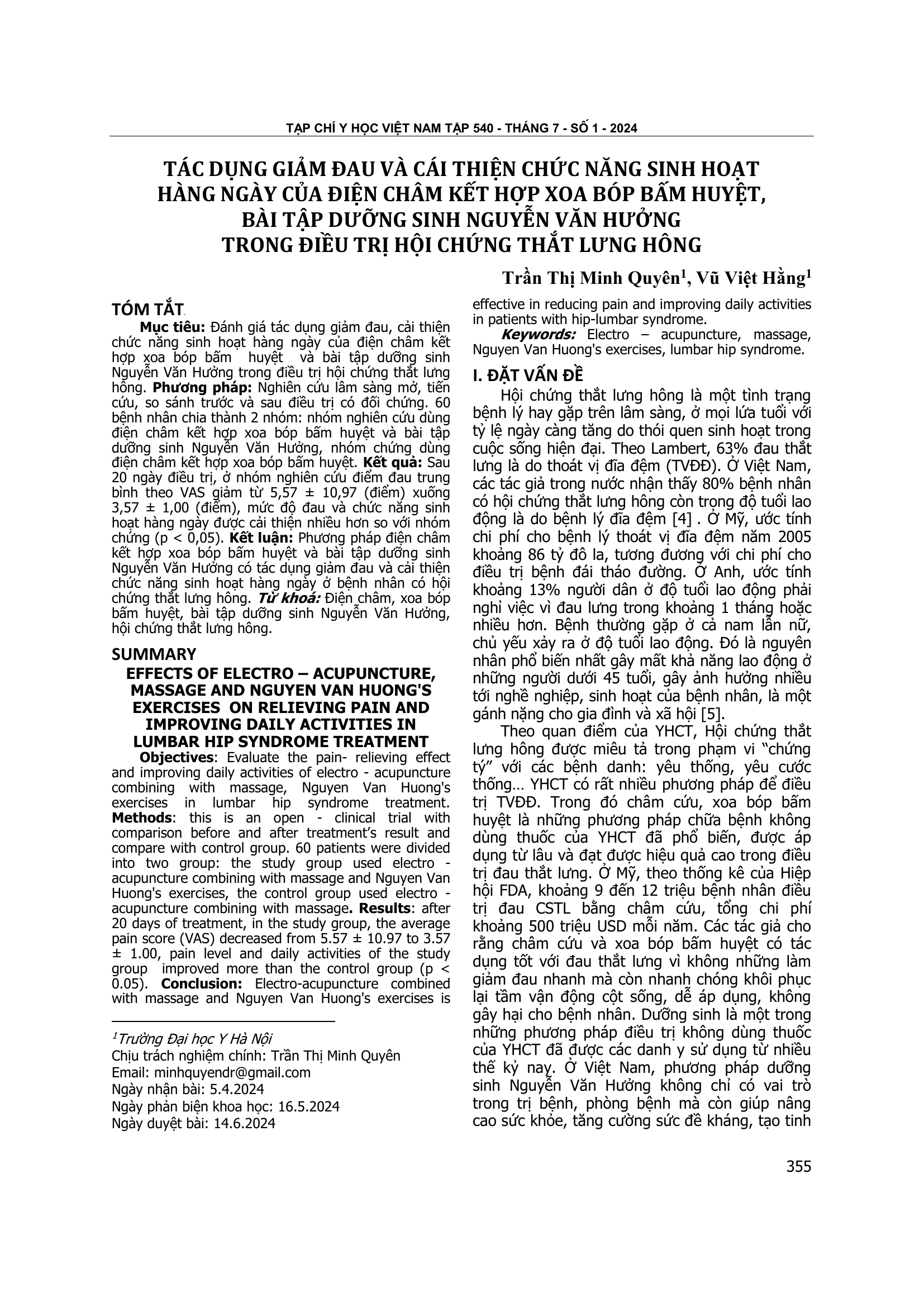Đánh giá tác dụng giảm đau, cải thiện chức năng sinh hoạt hàng ngày của điện châm kết hợp xoa bóp bấm huyệt và bài tập dưỡng sinh Nguyễn Văn Hưởng trong điều trị hội chứng thắt lưng hông. Phương pháp: Nghiên cứu lâm sàng mở, tiến cứu, so sánh trước và sau điều trị có đối chứng. 60 bệnh nhân chia thành 2 nhóm: nhóm nghiên cứu dùng điện châm kết hợp xoa bóp bấm huyệt và bài tập dưỡng sinh Nguyễn Văn Hưởng, nhóm chứng dùng điện châm kết hợp xoa bóp bấm huyệt. Kết quả: Sau 20 ngày điều trị, ở nhóm nghiên cứu điểm đau trung bình theo VAS giảm từ 5,57 ± 10,97 (điểm) xuống 3,57 ± 1,00 (điểm), mức độ đau và chức năng sinh hoạt hàng ngày được cải thiện nhiều hơn so với nhóm chứng (p < 0,05). Kết luận: Phương pháp điện châm kết hợp xoa bóp bấm huyệt và bài tập dưỡng sinh Nguyễn Văn Hưởng có tác dụng giảm đau và cải thiện chức năng sinh hoạt hàng ngày ở bệnh nhân có hội chứng thắt lưng hông.
