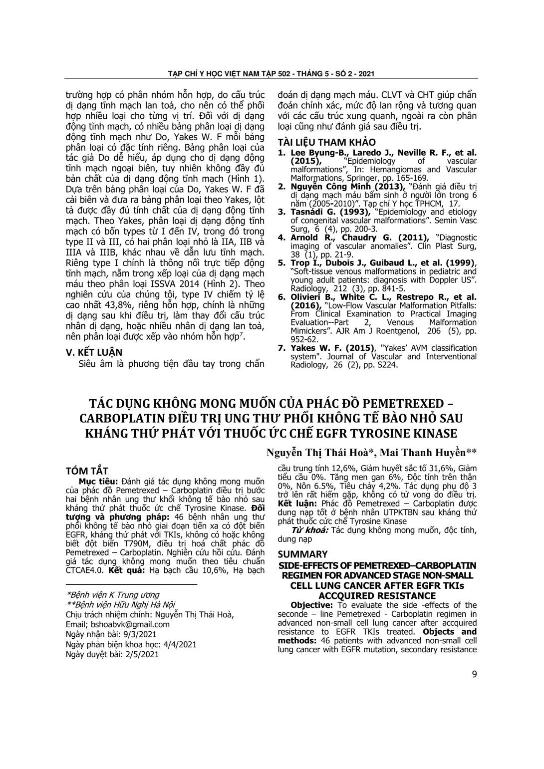 Đánh giá tác dụng không mong muốn của phác đồ Pemetrexed – Carboplatin điều trị bước hai bệnh nhân ung thư khổi không tế bào nhỏ sau kháng thứ phát thuốc ức chế Tyrosine Kinase. Đối tượng và phương pháp 46 bệnh nhân ung thư phổi không tế bào nhỏ giai đoạn tiến xa có đột biến EGFR, kháng thứ phát với TKIs, không có hoặc không biết đột biến T790M, điều trị hoá chất phác đồ Pemetrexed – Carboplatin. Nghiên cứu hồi cứu. Đánh giá tác dụng không mong muốn theo tiêu chuẩn CTCAE4.0. Kết quả Hạ bạch cầu 10,6%, Hạ bạch cầu trung tính 12,6%, Giảm huyết sắc tố 31,6%, Giảm tiểu cầu 0%. Tăng men gan 6%, Độc tính trên thận 0%, Nôn 6.5%, Tiêu chảy 4,2%. Tác dụng phụ độ 3 trở lên rất hiếm gặp, không có tử vong do điều trị. Kết luận Phác đồ Pemetrexed – Carboplatin được dung nạp tốt ở bệnh nhân UTPKTBN sau kháng thứ phát thuốc cức chế Tyrosine Kinase.