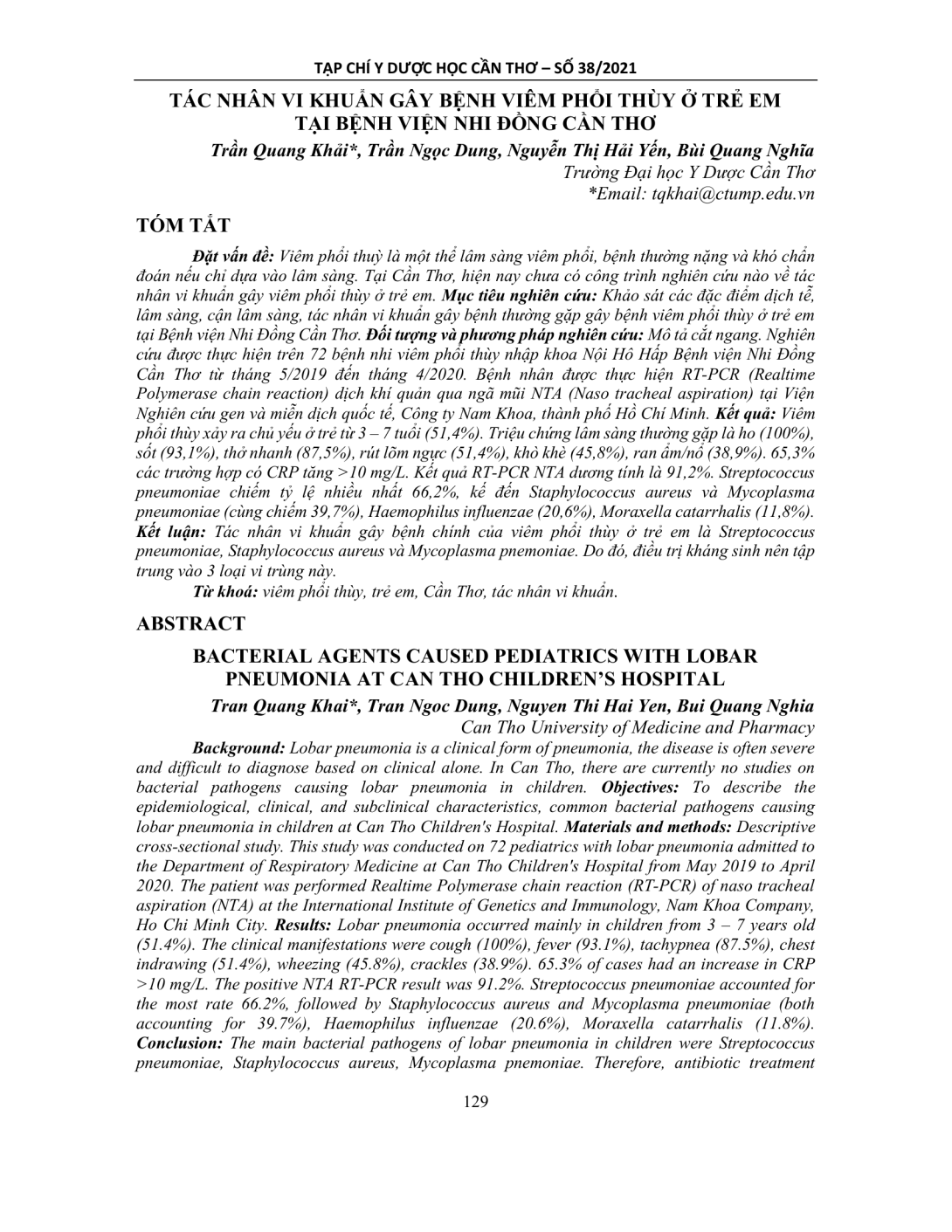 Viêm phổi thuỳ là một thể lâm sàng viêm phổi, bệnh thường nặng và khó chẩn đoán nếu chỉ dựa vào lâm sàng. Tại Cần Thơ, hiện nay chưa có công trình nghiên cứu nào về tác nhân vi khuẩn gây viêm phổi thùy ở trẻ em. Mục tiêu nghiên cứu: Khảo sát các đặc điểm dịch tễ, lâm sàng, cận lâm sàng, tác nhân vi khuẩn gây bệnh thường gặp gây bệnh viêm phổi thùy ở trẻ em tại Bệnh viện Nhi Đồng Cần Thơ. Đối tượng và phương pháp nghiên cứu: Mô tả cắt ngang. Nghiên cứu được thực hiện trên 72 bệnh nhi viêm phổi thùy nhập khoa Nội Hô Hấp Bệnh viện Nhi Đồng Cần Thơ từ tháng 5/2019 đến tháng 4/2020. Bệnh nhân được thực hiện RT-PCR (Realtime Polymerase chain reaction) dịch khí quản qua ngã mũi NTA (Naso tracheal aspiration) tại Viện Nghiên cứu gen và miễn dịch quốc tế, Công ty Nam Khoa, thành phố Hồ Chí Minh. Kết quả: Viêm phổi thùy xảy ra chủ yếu ở trẻ từ 3 – 7 tuổi (51,4%). Triệu chứng lâm sàng thường gặp là ho (100%), sốt (93,1%), thở nhanh (87,5%), rút lõm ngực (51,4%), khò khè (45,8%), ran ẩm/nổ (38,9%). 65,3% các trường hợp có CRP tăng >10 mg/L. Kết quả RT-PCR NTA dương tính là 91,2%. Streptococcus pneumoniae chiếm tỷ lệ nhiều nhất 66,2%, kế đến Staphylococcus aureus và Mycoplasma pneumoniae (cùng chiếm 39,7%), Haemophilus influenzae (20,6%), Moraxella catarrhalis (11,8%). Kết luận: Tác nhân vi khuẩn gây bệnh chính của viêm phổi thùy ở trẻ em là Streptococcus pneumoniae, Staphylococcus aureus và Mycoplasma pnemoniae. Do đó, điều trị kháng sinh nên tập trung vào 3 loại vi trùng này.
