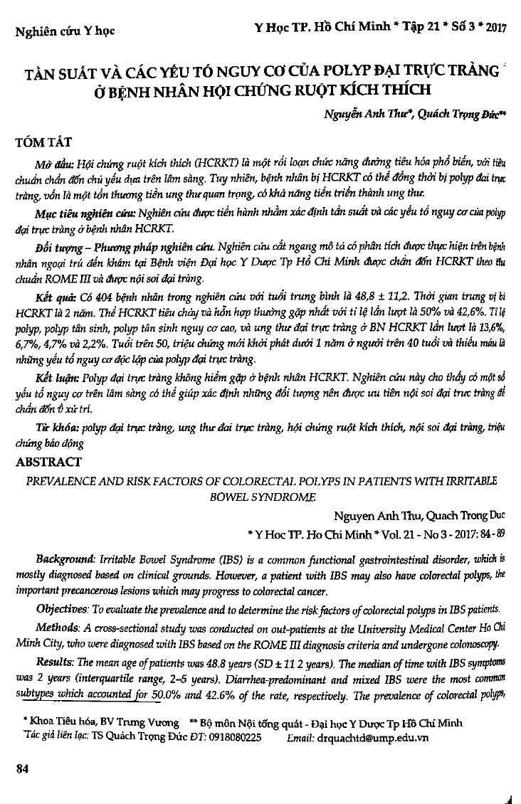 Xác định tần suất và các yếu tố nguy cơ của polyp đại trực tràng trên 404 bệnh nhân hội chứng ruột kích thích. Thời gian trung vị bị hội chứng ruột kích thích là 2 năm. Thể hội chứng ruột kích thích tiêu chảy và hỗ hợp thường gặp nhất. Tuổi trên 50, triệu chứng mới khởi phát dưới 1 năm ở người trên 40 tuổi và thiếu máu là những yếu tố nguy cơ độc lập của polyp đại trực tràng.
