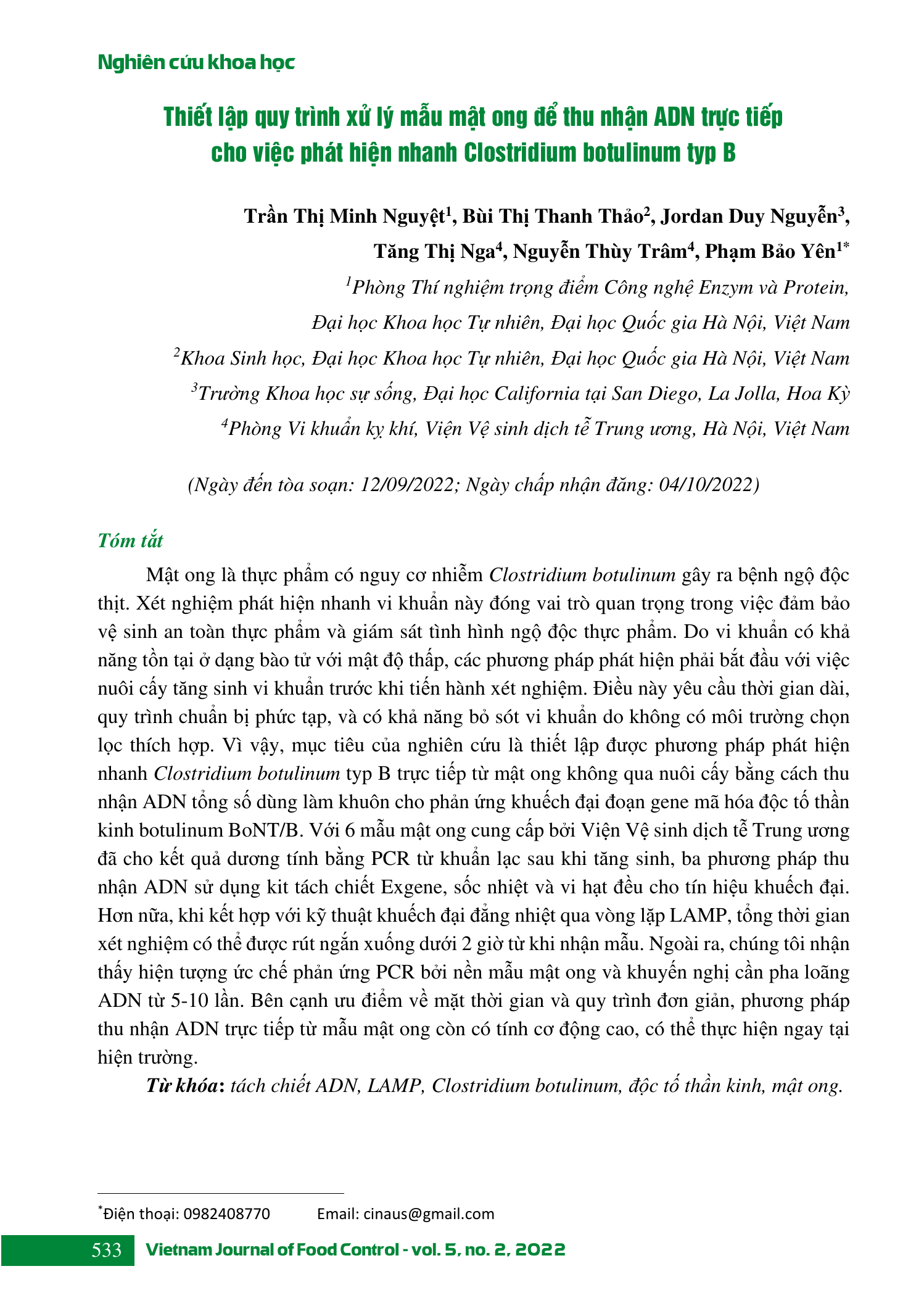 Mật ong là thực phẩm có nguy cơ nhiễm Clostridium botulinum gây ra bệnh ngộ độc thịt. Xét nghiệm phát hiện nhanh vi khuẩn này đóng vai trò quan trọng trong việc đảm bảo vệ sinh an toàn thực phẩm và giám sát tình hình ngộ độc thực phẩm. Do vi khuẩn có khả năng tồn tại ở dạng bào tử với mật độ thấp, các phương pháp phát hiện phải bắt đầu với việc nuôi cấy tăng sinh vi khuẩn trước khi tiến hành xét nghiệm. Điều này yêu cầu thời gian dài, quy trình chuẩn bị phức tạp, và có khả năng bỏ sót vi khuẩn do không có môi trường chọn lọc thích hợp. Vì vậy, mục tiêu của nghiên cứu là thiết lập được phương pháp phát hiện nhanh Clostridium botulinum typ B trực tiếp từ mật ong không qua nuôi cấy bằng cách thu nhận ADN tổng số dùng làm khuôn cho phản ứng khuếch đại đoạn gene mã hóa độc tố thần kinh botulinum BoNT/B. Với 6 mẫu mật ong cung cấp bởi Viện Vệ sinh dịch tễ Trung ương đã cho kết quả dương tính bằng PCR từ khuẩn lạc sau khi tăng sinh, ba phương pháp thu nhận ADN sử dụng kit tách chiết Exgene, sốc nhiệt và vi hạt đều cho tín hiệu khuếch đại. Hơn nữa, khi kết hợp với kỹ thuật khuếch đại đẳng nhiệt qua vòng lặp LAMP, tổng thời gian xét nghiệm có thể được rút ngắn xuống dưới 2 giờ từ khi nhận mẫu. Ngoài ra, chúng tôi nhận thấy hiện tượng ức chế phản ứng PCR bởi nền mẫu mật ong và khuyến nghị cần pha loãng ADN từ 5-10 lần. Bên cạnh ưu điểm về mặt thời gian và quy trình đơn giản, phương pháp thu nhận ADN trực tiếp từ mẫu mật ong còn có tính cơ động cao, có thể thực hiện ngay tại hiện trường.