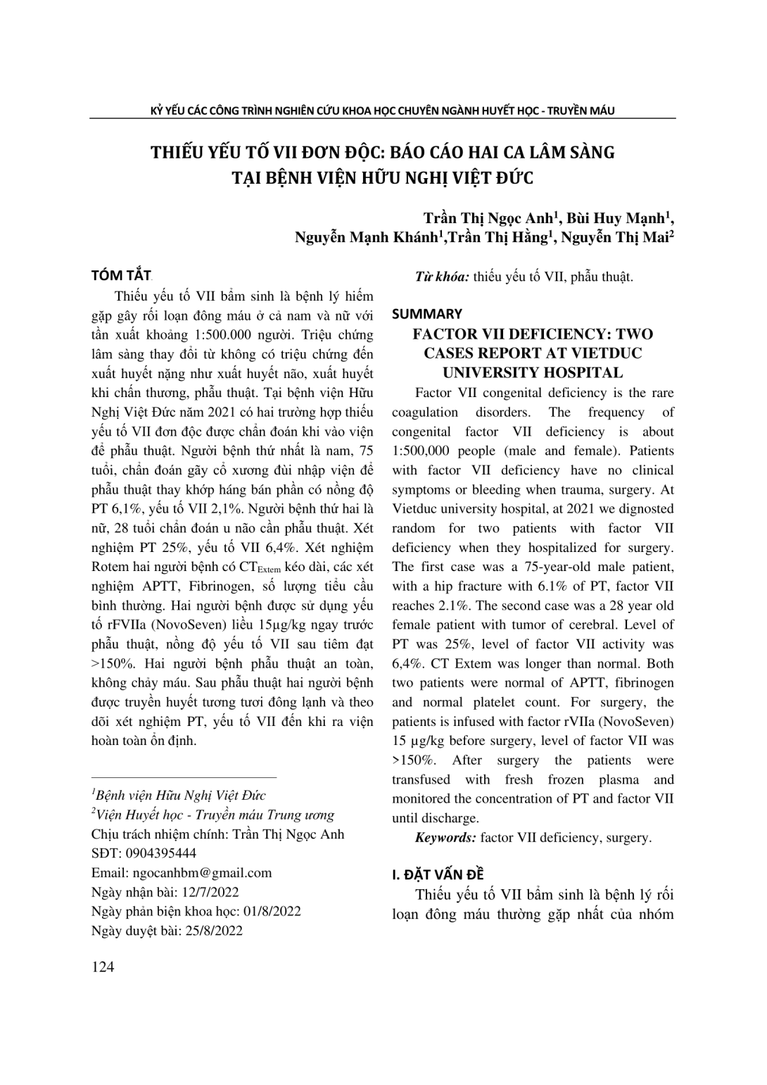 Thiếu yếu tố VII bẩm sinh là bệnh lý hiếm gặp gây rối loạn đông máu ở cả nam và nữ với tần xuất khoảng 1:500.000 người. Triệu chứng lâm sàng thay đổi từ không có triệu chứng đến xuất huyết nặng như xuất huyết não, xuất huyết khi chấn thương, phẫu thuật. Tại bệnh viện Hữu Nghị Việt Đức năm 2021 có hai trường hợp thiếu yếu tố VII đơn độc được chẩn đoán khi vào viện để phẫu thuật. Người bệnh thứ nhất là nam, 75 tuổi, chẩn đoán gãy cổ xương đùi nhập viện để phẫu thuật thay khớp háng bán phần có nồng độ PT 6,1%, yếu tố VII 2,1%. Người bệnh thứ hai là nữ, 28 tuổi chẩn đoán u não cần phẫu thuật. Xét nghiệm PT 25%, yếu tố VII 6,4%. Xét nghiệm Rotem hai người bệnh có CTExtem kéo dài, các xét nghiệm APTT, Fibrinogen, số lượng tiểu cầu bình thường. Hai người bệnh được sử dụng yếu tố rFVIIa (NovoSeven) liều 15μg/kg ngay trước phẫu thuật, nồng độ yếu tố VII sau tiêm đạt >150%. Hai người bệnh phẫu thuật an toàn, không chảy máu. Sau phẫu thuật hai người bệnh được truyền huyết tương tươi đông lạnh và theo dõi xét nghiệm PT, yếu tố VII đến khi ra viện hoàn toàn ổn định.