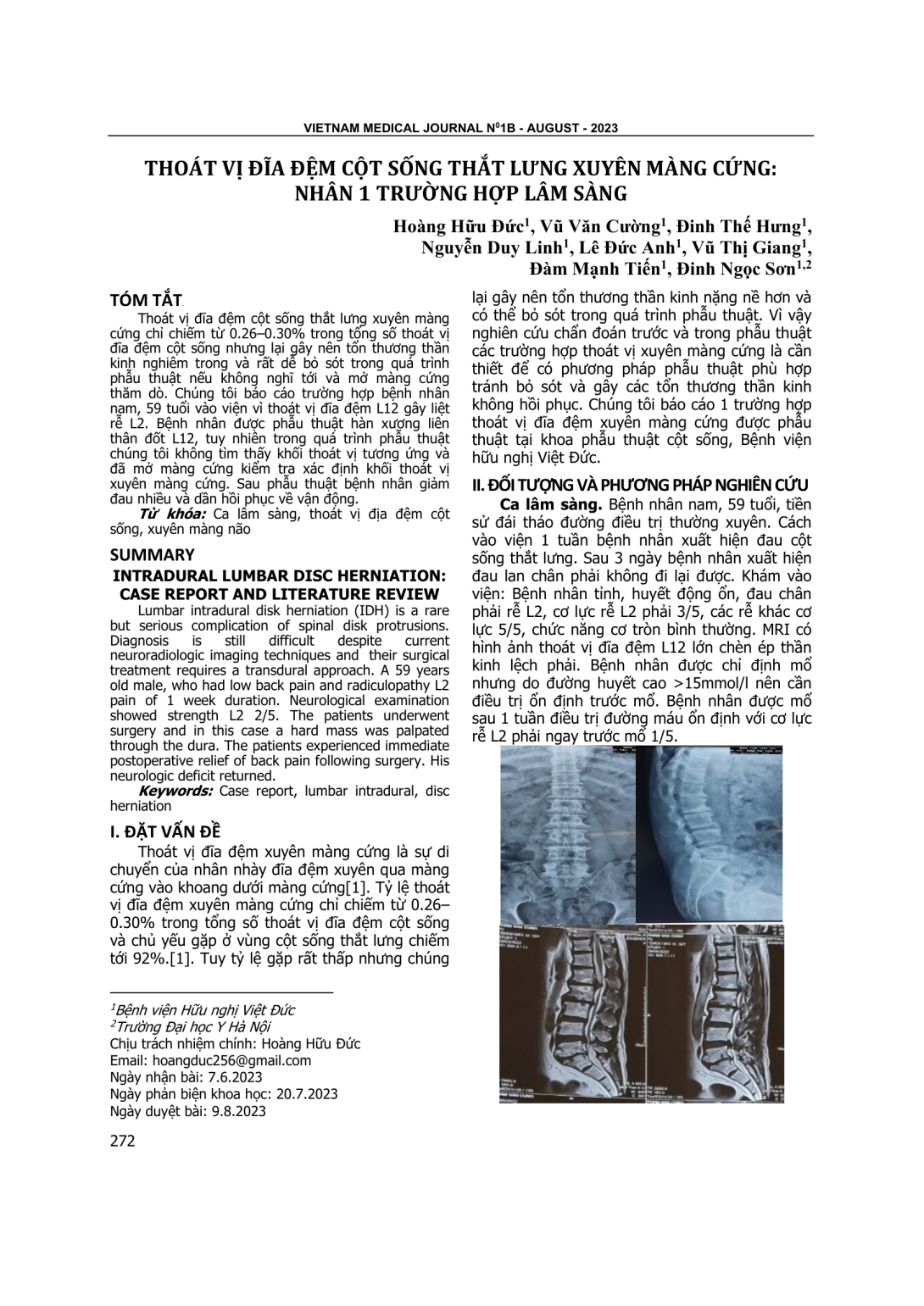 Thoát vị đĩa đệm cột sống thắt lưng xuyên màng cứng chỉ chiếm từ 0.26–0.30% trong tổng số thoát vị đĩa đệm cột sống nhưng lại gây nên tổn thương thần kinh nghiêm trong và rất dễ bỏ sót trong quá trình phẫu thuật nếu không nghĩ tới và mở màng cứng thăm dò. Chúng tôi báo cáo trường hợp bệnh nhân nam, 59 tuổi vào viện vì thoát vị đĩa đệm L12 gây liệt rễ L2. Bệnh nhân được phẫu thuật hàn xương liên thân đốt L12, tuy nhiên trong quá trình phẫu thuật chúng tôi không tìm thấy khối thoát vị tương ứng và đã mở màng cứng kiểm tra xác định khối thoát vị xuyên màng cứng. Sau phẫu thuật bệnh nhân giảm đau nhiều và dần hồi phục về vận động.
