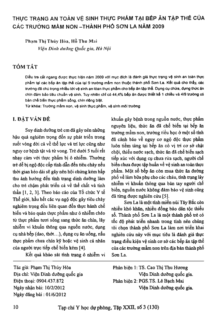 Thực trạng an toàn vệ sinh thực phẩm tại bếp ăn tập thể của các trường mầm non - thành phố Sơn La năm 2009