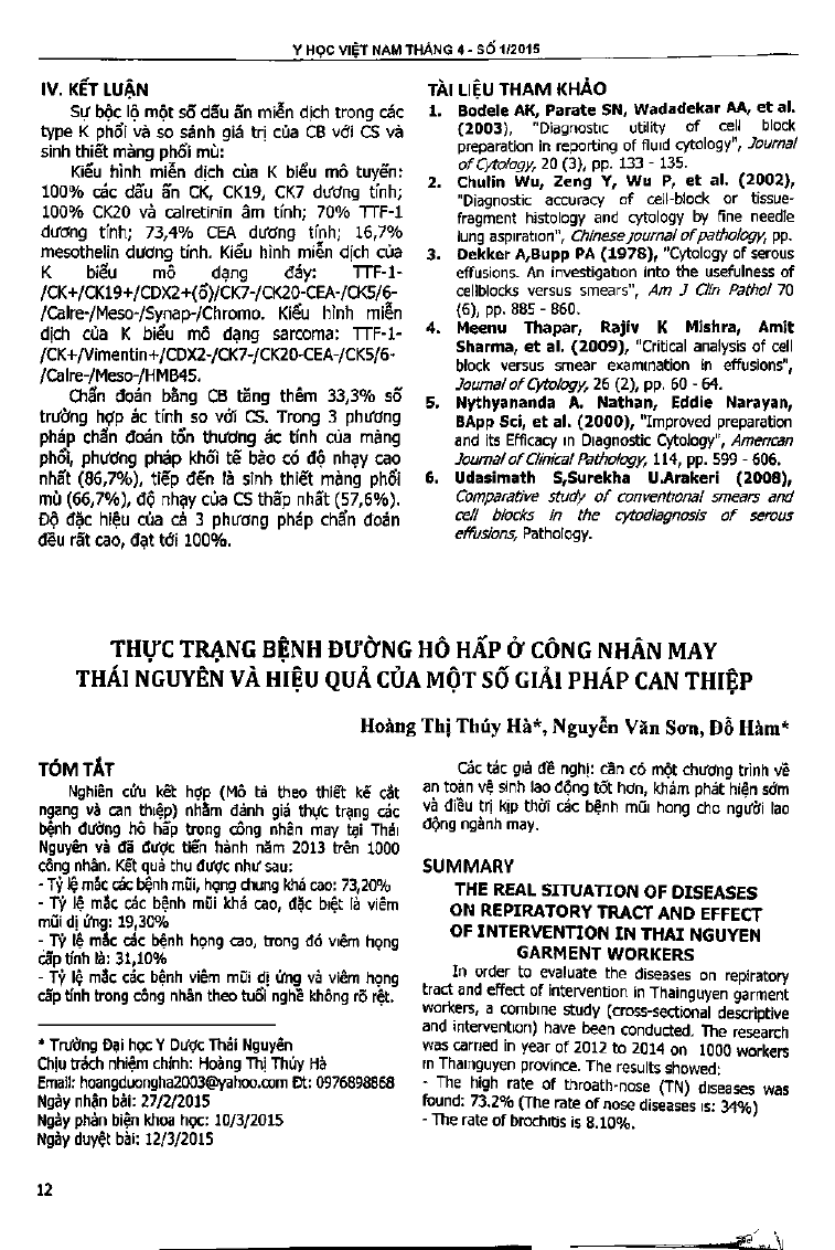 Thực trạng bệnh đường hô hấp ở công nhân may Thái Nguyên và hiệu quả của một số giải pháp can thiệp