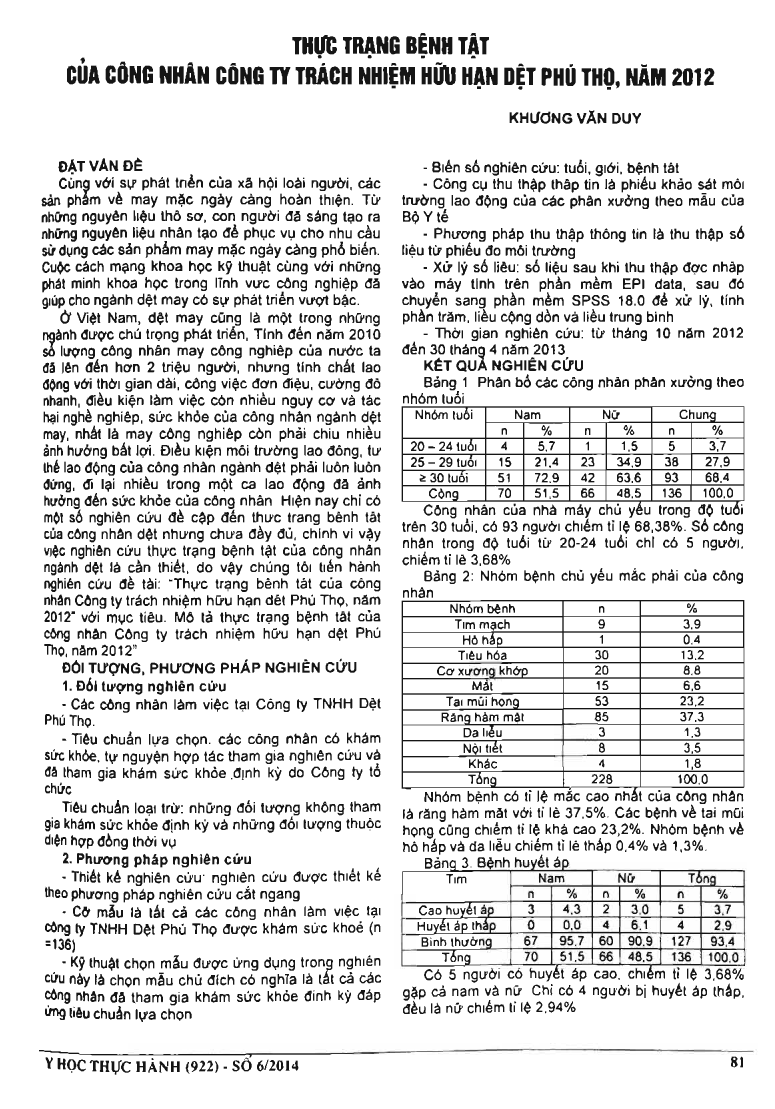 Thực trạng bệnh tật của công nhân công ty trách nhiệm hữu hạn dệt Phú Thọ, năm 2012