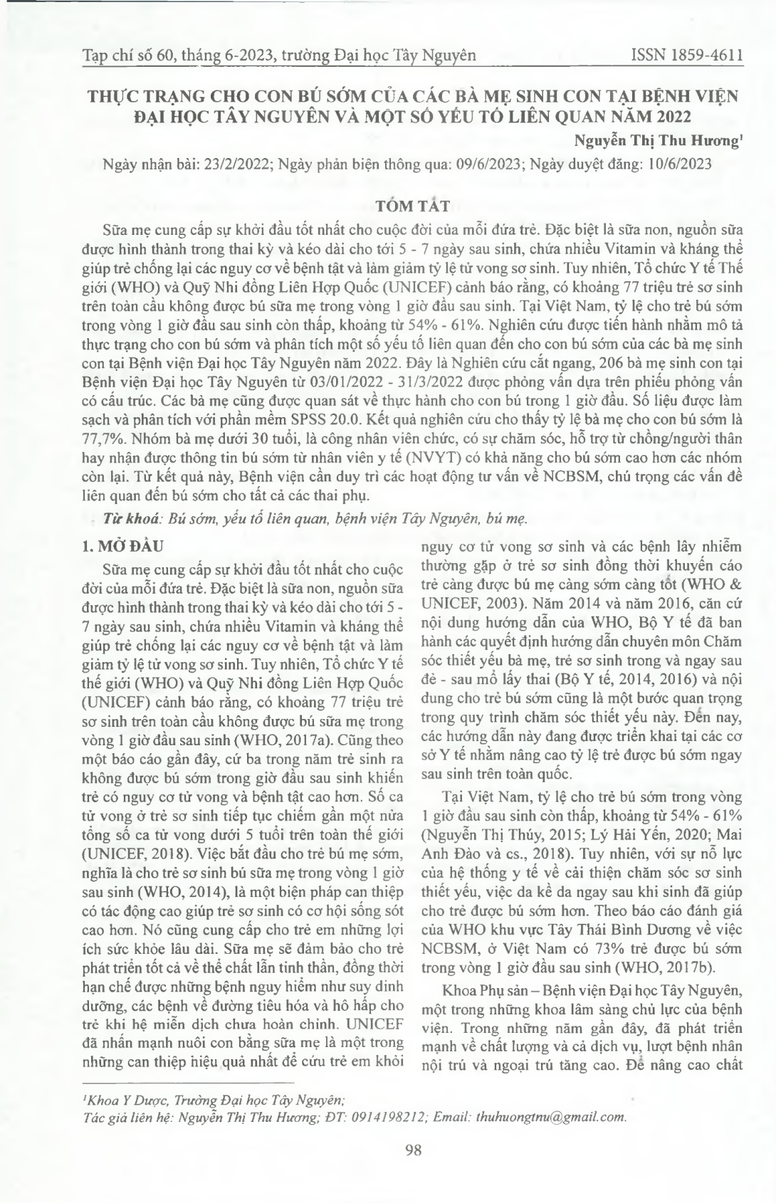 Sữa mẹ cung cấp sự khởi đầu tốt nhất cho cuộc đời của mỗi đứa trẻ. Đặc biệt là sữa non, nguồn sữa được hình thành trong thai kỳ và kéo dài cho tới 5 - 7 ngày sau sinh, chứa nhiều Vitamin và kháng thể giúp trẻ chống lại các nguy cơ về bệnh tật và làm giảm tỷ lệ tử vong sơ sinh. Tuy nhiên, Tổ chức Y tế Thế giới (WHO) và Quỹ Nhi đồng Liên Hợp Quốc (UNICEF) cảnh báo rằng, có khoảng 77 triệu trẻ sơ sinh trên toàn cầu không được bú sữa mẹ trong vòng 1 giờ đầu sau sinh. Tại Việt Nam, tỷ lệ cho trẻ bú sớm trong vòng 1 giờ đầu sau sinh còn thấp, khoảng từ 54% - 61%. Nghiên cứu được tiến hành nhằm mô tả thực trạng cho con bú sớm và phân tích một số yếu tố liên quan đến cho con bú sớm của các bà mẹ sinh con tại Bệnh viện Đại học Tây Nguyên năm 2022. Đây là Nghiên cứu cắt ngang, 206 bà mẹ sinh con tại Bệnh viện Đại học Tây Nguyên từ 03/01/2022 - 31/3/2022 được phỏng vấn dựa trên phiếu phỏng vấn có cấu trúc. Các bà mẹ cũng được quan sát về thực hành cho con bú trong 1 giờ đầu. Số liệu được làm sạch và phân tích với phần mềm SPSS 20.0. Kết quả nghiên cứu cho thấy tỷ lệ bà mẹ cho con bú sớm là 77,7%. Nhóm bà mẹ dưới 30 tuổi, là công nhân viên chức, có sự chăm sóc, hỗ trợ từ chồng/người thân hay nhận được thông tin bú sớm từ nhân viên y tế (NVYT) có khả năng cho bú sớm cao hơn các nhóm còn lại. Từ kết quả này, Bệnh viện cần duy trì các hoạt động tư vấn về NCBSM, chú trọng các vấn đề liên quan đến bú sớm cho tất cả các thai phụ.