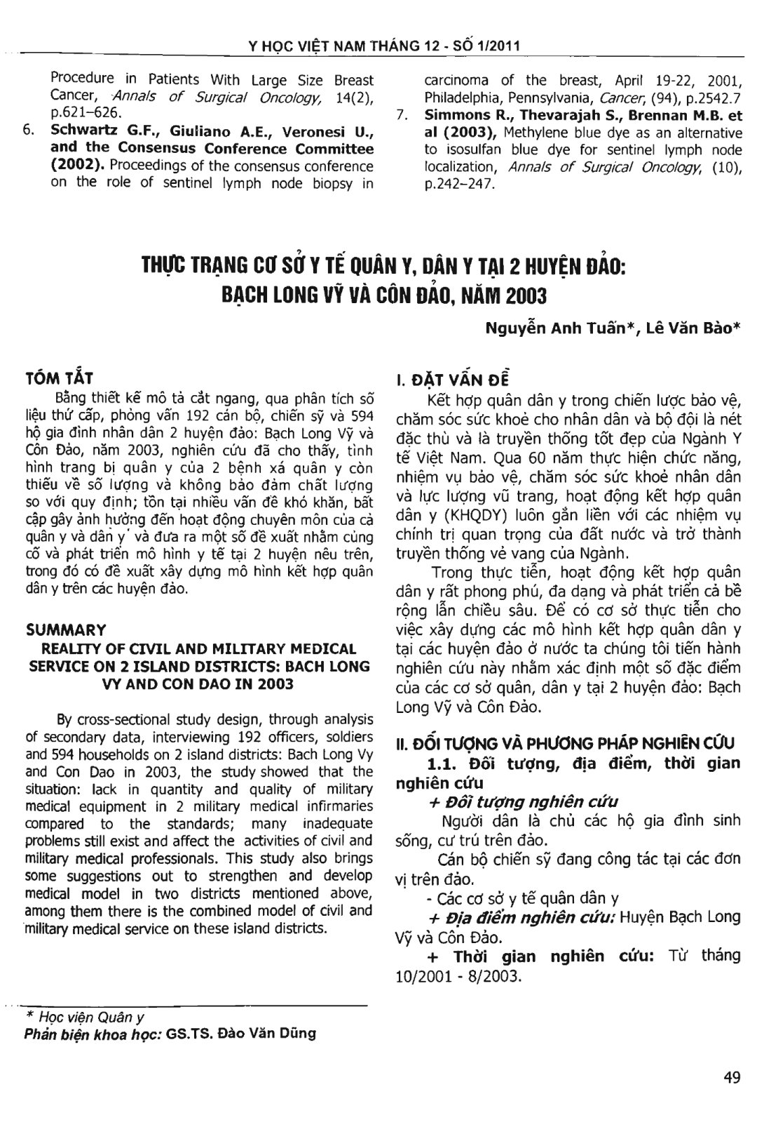 By cross-sectional study design, through analysis of secondary data, interviewing 192 officers, soldiers and 594 households on 2 island districts: Bach Long Vy and Con Dao in 2003, the study showed that the situation: lack in quantity and quality of military medical equipment in 2 military medical infirmaries compared to the standards; many inadequate problems still exist and affect the activities of civil and military medical professionals. This study also brings some suggestions out to strengthen and develop medical model in two districts mentioned above, among them there is the combined model of civil and military medical service on these island districts.