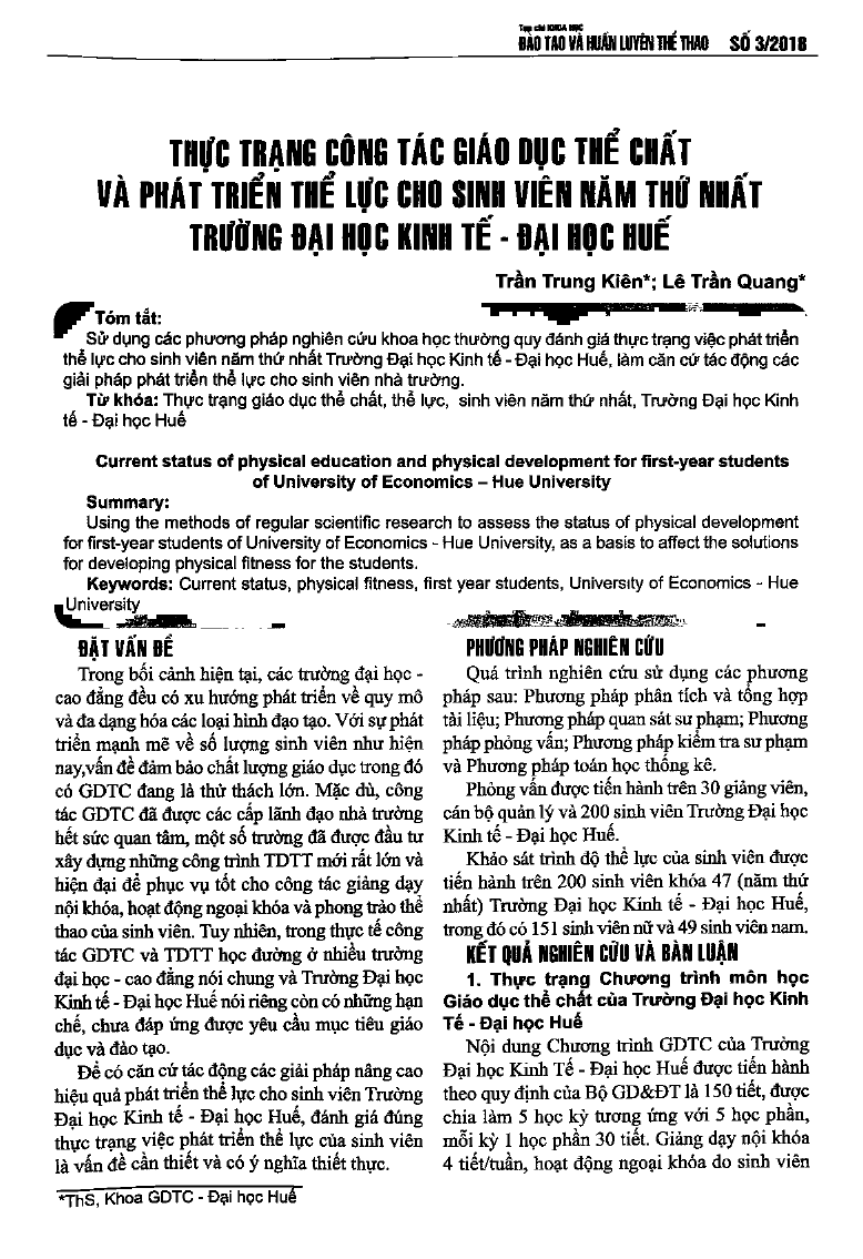 Thực trạng công tác giáo dục thể chất và phát triển thể lực cho sinh viên năm thứ nhất trường Đại học Kinh tế - Đại học Huế