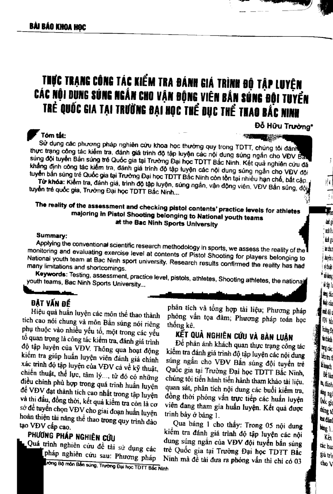 Thực trạng công tác kiểm tra đánh giá trình độ tập luyện các nội dung súng ngắn cho vận động viên bắn súng đội tuyển trẻ quốc gia tại trường Đại học TDTT Bắc Ninh
