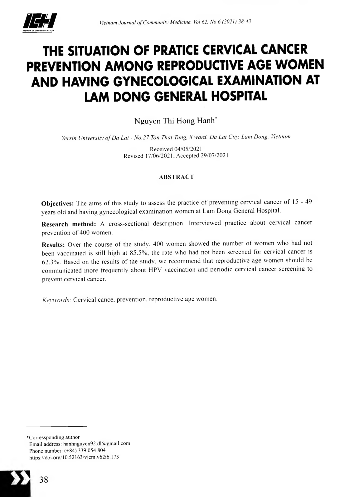 Thực trạng dự phòng ung thư cổ tử cung của phụ nữ trong độ tuổi sinh sản khám phụ khoa tại bệnh viện đa khoa tỉnh Lâm Đồng