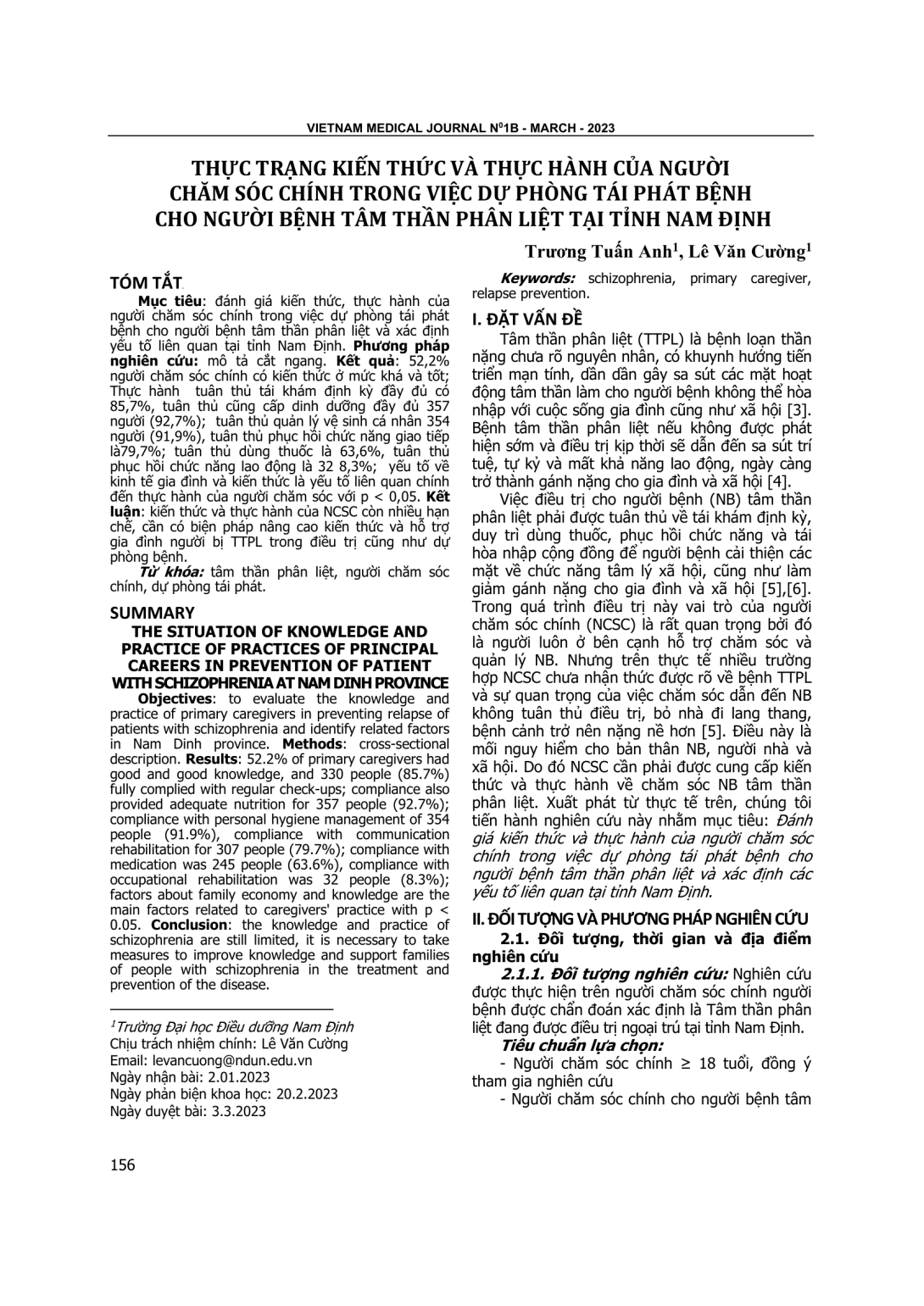 Đánh giá kiến thức, thực hành của người chăm sóc chính trong việc dự phòng tái phát bệnh cho người bệnh tâm thần phân liệt và xác định yếu tố liên quan tại tỉnh Nam Định. Phương pháp nghiên cứu: mô tả cắt ngang. Kết quả: 52,2% người chăm sóc chính có kiến thức ở mức khá và tốt; Thực hành tuân thủ tái khám định kỳ đầy đủ có 85,7%, tuân thủ cũng cấp dinh dưỡng đầy đủ 357 người (92,7%); tuân thủ quản lý vệ sinh cá nhân 354 người (91,9%), tuân thủ phục hồi chức năng giao tiếp là79,7%; tuân thủ dùng thuốc là 63,6%, tuân thủ phục hồi chức năng lao động là 32 8,3%; yếu tố về kinh tế gia đình và kiến thức là yếu tố liên quan chính đến thực hành của người chăm sóc với p < 0,05. Kết luận: kiến thức và thực hành của NCSC còn nhiều hạn chế, cần có biện pháp nâng cao kiến thức và hỗ trợ gia đình người bị TTPL trong điều trị cũng như dự phòng bệnh.