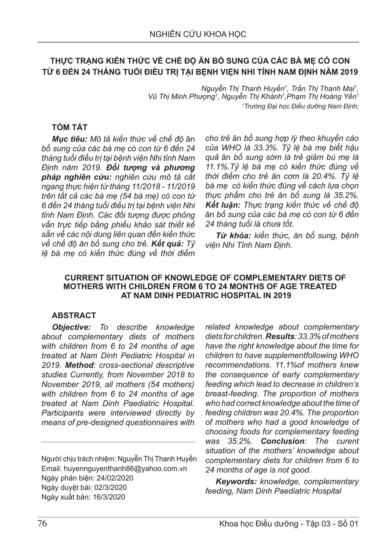 Mô tả kiến thức về chế độ ăn bổ sung của các bà mẹ có con từ 6 đến 24 tháng tuổi điều trị tại bệnh viện Nhi tỉnh Nam Định năm 2019. Đối tượng và phương pháp nghiên cứu nghiên cứu mô tả cắt ngang thực hiện từ tháng 11/2018 - 11/2019 trên tất cả các bà mẹ (54 bà mẹ) có con từ 6 đến 24 tháng tuổi điều trị tại bệnh viện Nhi tỉnh Nam Định. Các đối tượng được phỏng vấn trực tiếp bằng phiếu khảo sát thiết kế sẵn về các nội dung liên quan đến kiến thức về chế độ ăn bổ sung cho trẻ. Kết quả Tỷ lệ bà mẹ có kiến thức đúng về thời điểm cho trẻ ăn bổ sung hợp lý theo khuyến cáo của WHO là 33.3%. Tỷ lệ bà mẹ biết hậu quả ăn bổ sung sớm là trẻ giảm bú mẹ là 11.1%.Tỷ lệ bà mẹ có kiến thức đúng về thời điểm cho trẻ ăn cơm là 20.4%. Tỷ lệ bà mẹ có kiến thức đúng về cách lựa chọn thực phẩm cho trẻ ăn bổ sung là 35.2%.