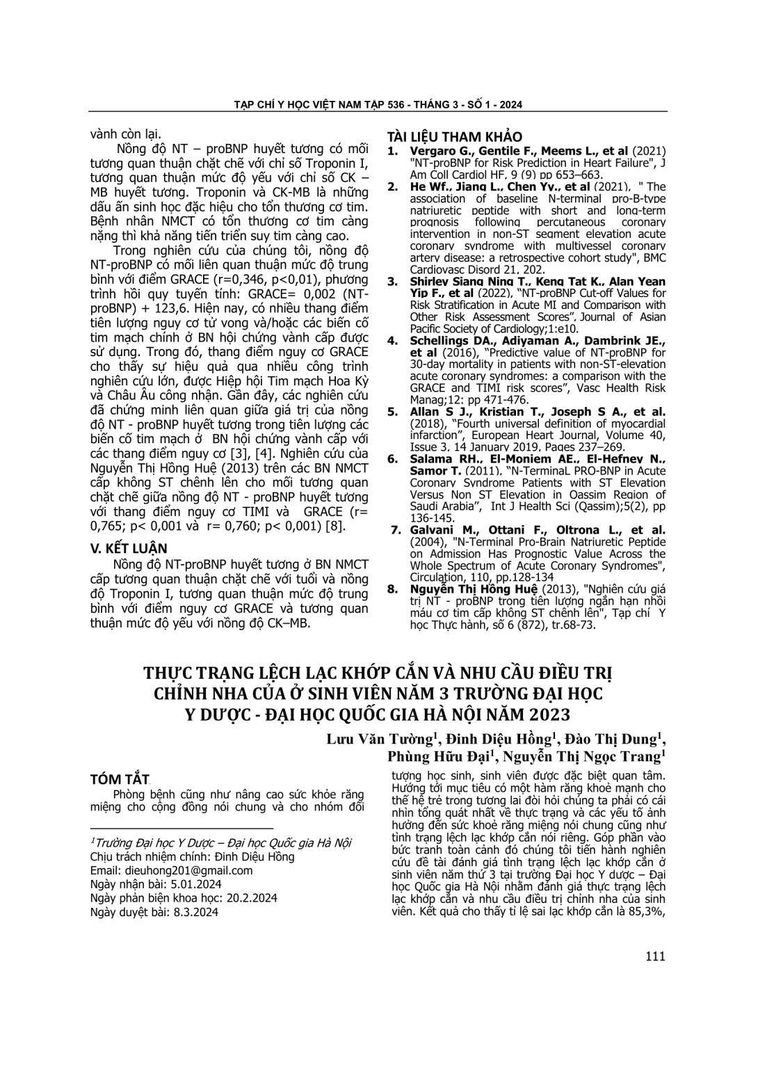 The study was conducted on 68 students at university of medicine and pharmacy – Vietnam national university Hanoi in 2023 to estimate the status of malocclusion and orthodontic treatment needs. The results showed that the proportion of malocclusion was 85,3%, the most common type of malocclusion is Class I was 58,8%, class III malocclusion was 19,1% and class II malocclusion was 7,4%. The treatment needs according to dental aesthetics is 57,4%, according to dental health is 82,4%.