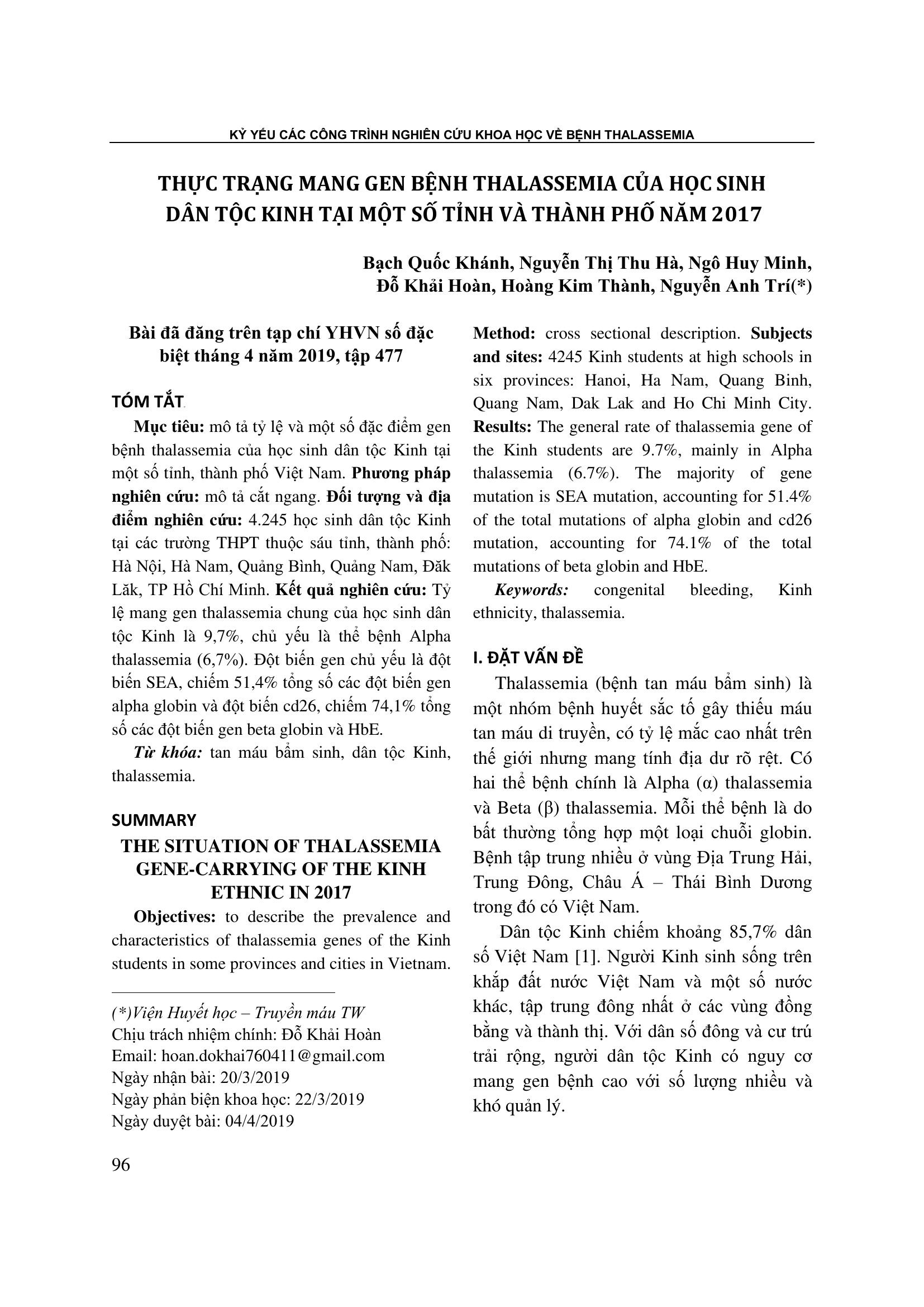 Mô tả tỷ lệ và một số đặc điểm gen bệnh thalassemia của học sinh dân tộc Kinh tại một số tỉnh, thành phố Việt Nam. Phương pháp nghiên cứu: mô tả cắt ngang. Đối tượng và địa điểm nghiên cứu: 4.245 học sinh dân tộc Kinh tại các trường THPT thuộc sáu tỉnh, thành phố: Hà Nội, Hà Nam, Quảng Bình, Quảng Nam, Đăk Lăk, TP Hồ Chí Minh. Kết quả nghiên cứu: Tỷ lệ mang gen thalassemia chung của học sinh dân tộc Kinh là 9,7%, chủ yếu là thể bệnh Alpha thalassemia (6,7%). Đột biến gen chủ yếu là đột biến SEA, chiếm 51,4% tổng số các đột biến gen alpha globin và đột biến cd26, chiếm 74,1% tổng số các đột biến gen beta globin và HbE.