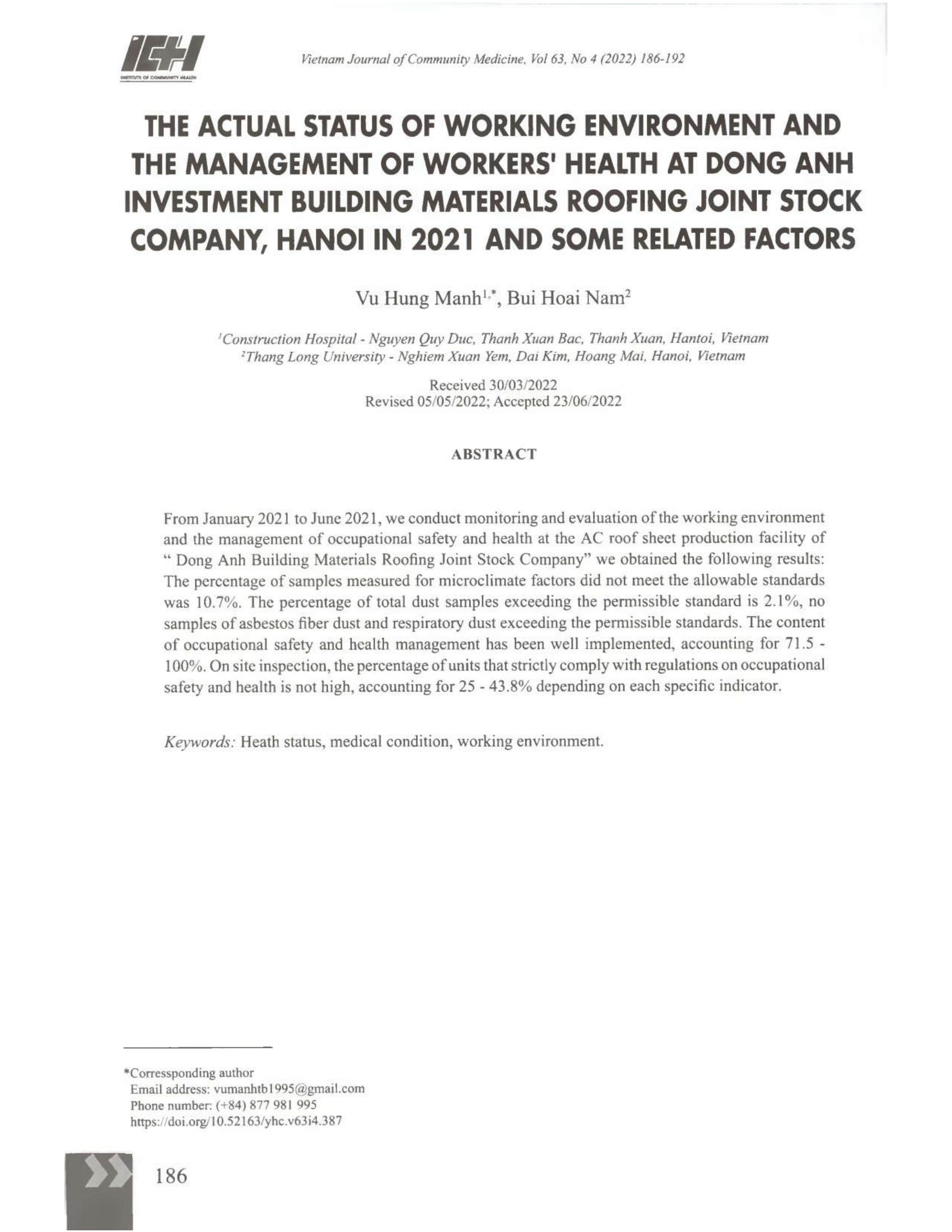 Thực trạng môi trường lao động và công tác quản lý sức khỏe người lao động tại Công ty Cổ phần đầu tư, xây lắp và vật liệu xây dựng Đông Anh, Hà Nội năm 2021 và một số yếu tố liên quan