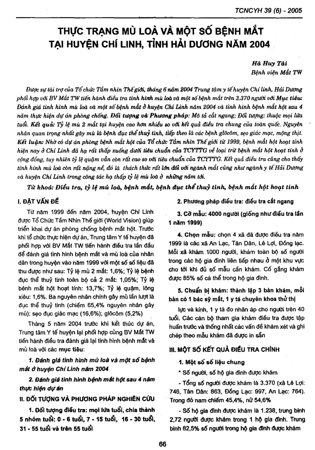 Thực trạng mù lòa và một số bệnh mắt tại huyện Chí Linh, tỉnh Hải Dương năm 2004