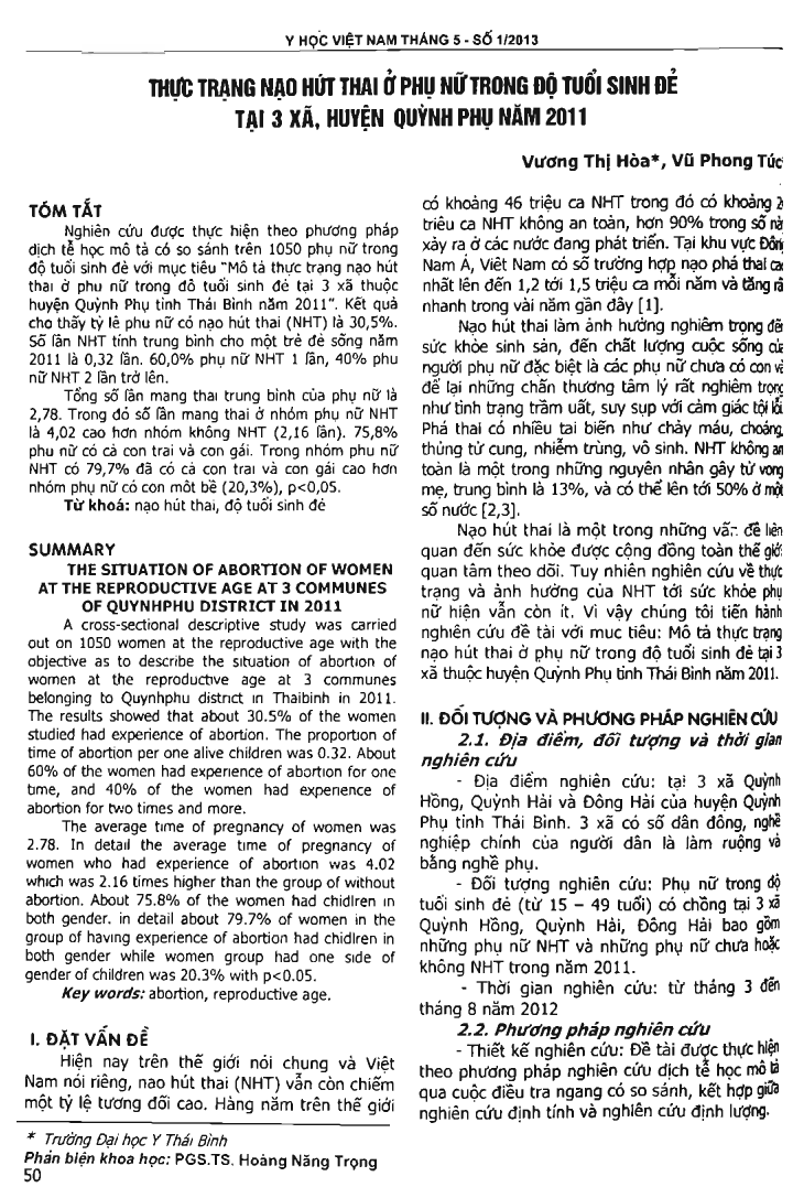 Thực trạng nạo hút thai ở phụ nữ trong độ tuổi sinh đẻ tại 3 xã, huyện Quỳnh Phụ năm 2011