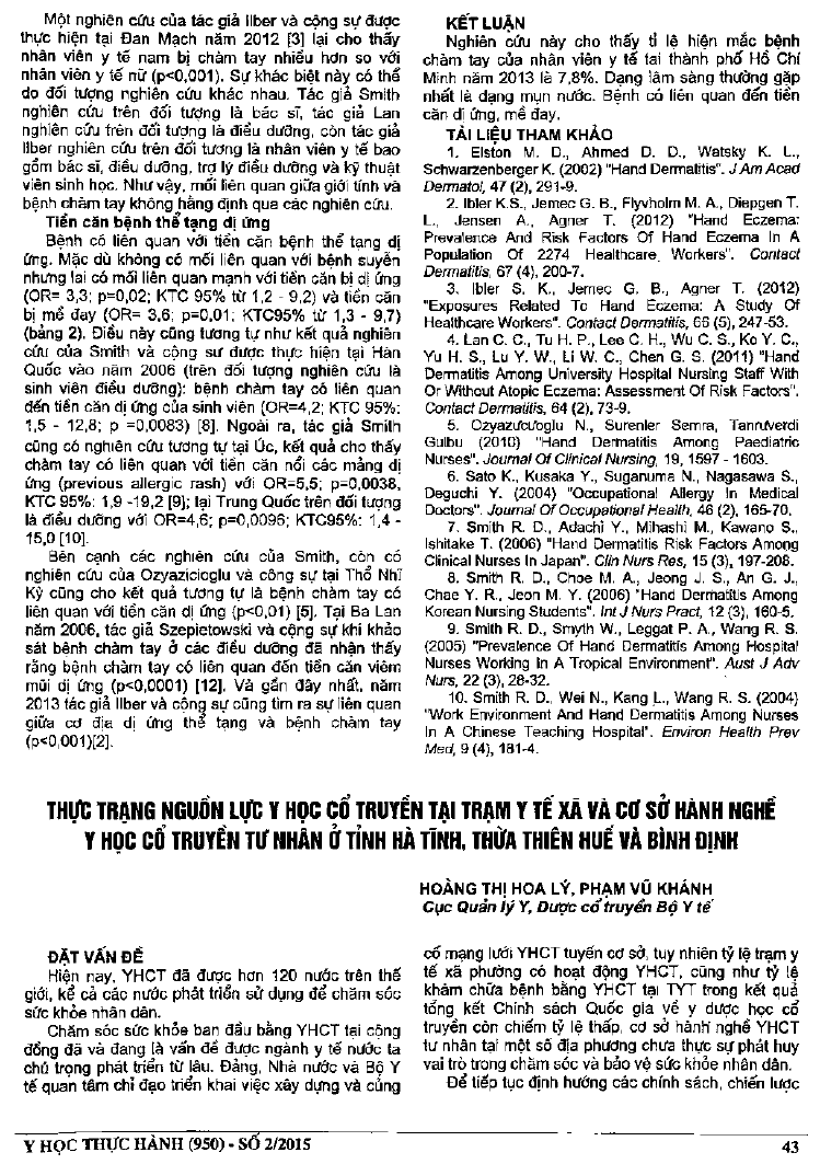 Through researches 143 commune health staffs on the operation of traditional medicine at commune health stations in Ha Tinh Province, Thua Thien Hue Province and Binh Dinh Province the authors have noticed that: Human resources for traditional medicine in primary care has lacked in quantity, has not ensured qualification. Number of staff with deep expertise in traditional medicine is so limited. Not have the payroll for staff working in traditional medicine in health stations. At the communal health stations still have little understanding of the development of traditional policies and legal documents relating, on the other hand have little access to update these reviews new as well as the professional training of traditional. Knowledge of Acupuncturists of commune health workers is inadequate. Number The traditional private practice mainly operate alone, the combination of traditional medicine with modem medicine proportion low.
