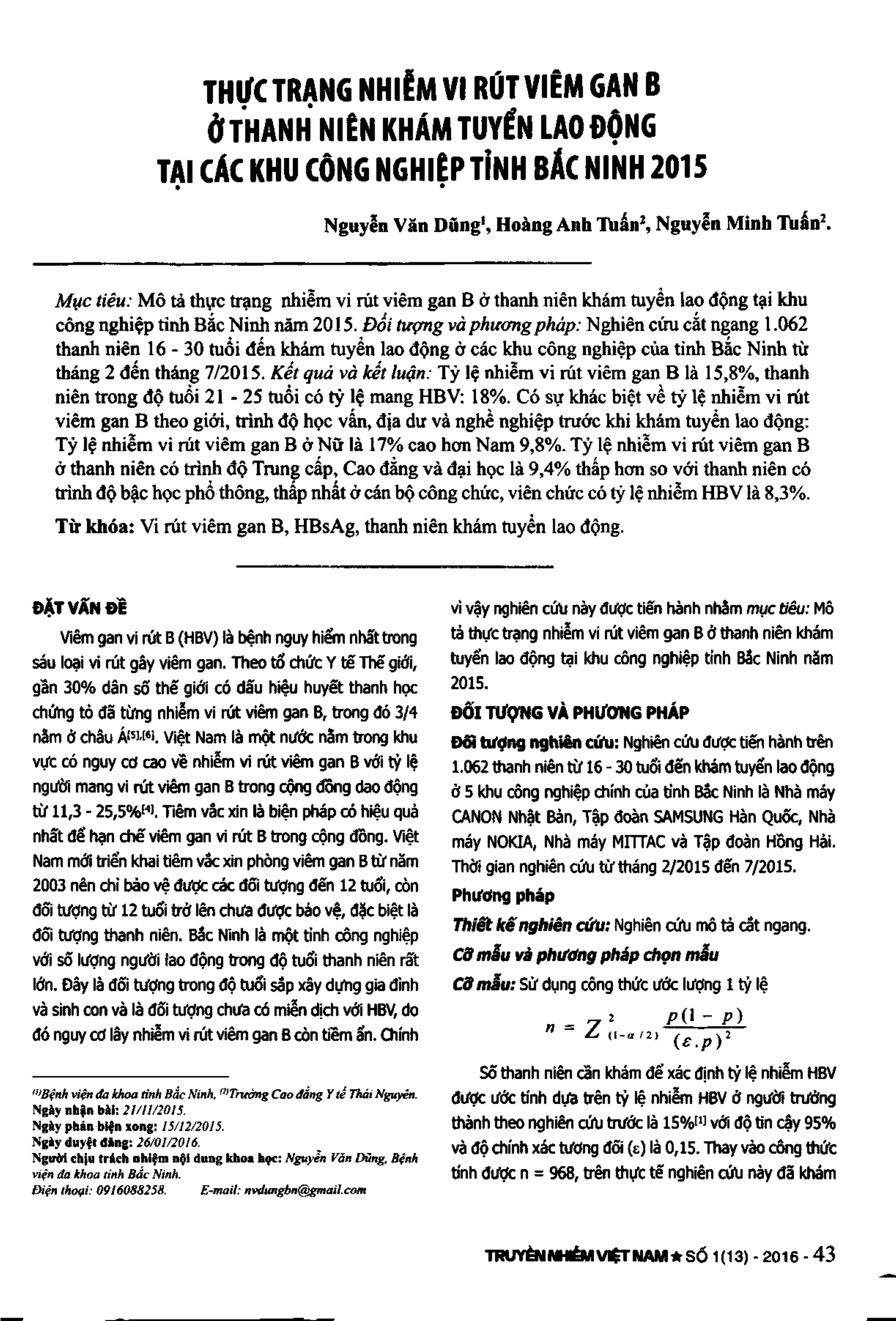Thực trạng nhiễm vi rút viêm gan B ở thanh niên khám tuyển lao động tại các khu công nghiệp tỉnh Bắc Ninh 2015