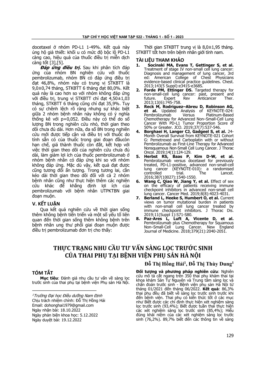Đánh giá nhu cầu tư vấn về sàng lọc trước sinh của thai phụ tại bệnh viện Phụ sản Hà Nội. Đối tượng và phương pháp nghiên cứu: Nghiên cứu mô tả cắt ngang trên 350 thai phụ khám thai tại khoa khám Sản Tự Nguyện và Trung tâm sàng lọc và chẩn đoán trước sinh - Bệnh viện phụ sản Hà Nội từ tháng 01/2021 đến tháng 06/2022. Kết quả: 86,3% thai phụ đều đã biết về sàng lọc trước sinh trước khi đến bệnh viện. Thai phụ có kiến thức tốt ở các mục như Biết được các chỉ định thực hiện xét nghiệm sàng lọc trước sinh (93,4%); Biết được tuần thai thực hiện các xét nghiệm sàng lọc trước sinh (85,4%); Hiểu đúng khái niệm của các xét nghiệm sàng lọc trước sinh (76,2%). 89,7% biết đến các thông tin về sàng lọc, chẩn đoán trước sinh từ kinh nghiệm bản thân và từ người quen, tiếp đến là từ mạng xã hội và internet. Về nhu cầu tư vấn, chỉ có 59 (16,9%) các thai phụ có nhu cầu tư vấn, tìm hiểu về sàng lọc trước sinh. Kết luận: Trong nhóm thai phụ có nhu cầu được tư vấn: 37 (62,7%) đối tượng muốn được biết thêm về mục đích cũng như chỉ định thực hiện xét nghiệm sàng lọc trước sinh. 18 (30,5%) muốn biết thêm về các loại xét nghiệm sàng lọc trước sinh hiện có.