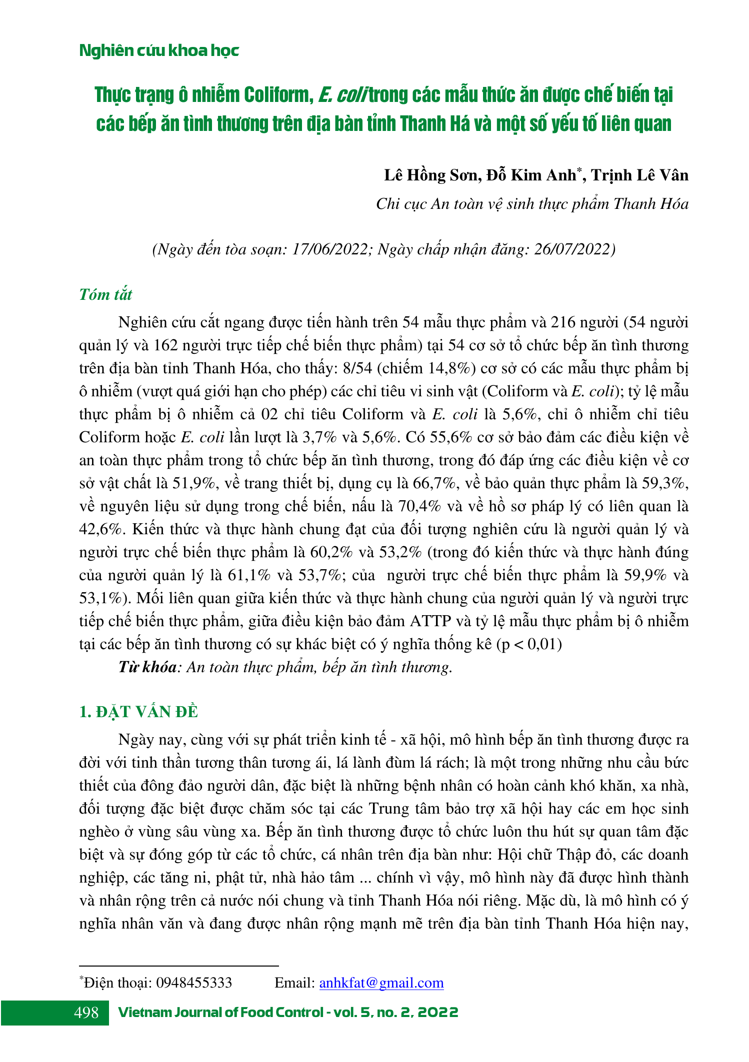 Nghiên cứu cắt ngang được tiến hành trên 54 mẫu thực phẩm và 216 người (54 người quản lý và 162 người trực tiếp chế biến thực phẩm) tại 54 cơ sở tổ chức bếp ăn tình thương trên địa bàn tỉnh Thanh Hóa, cho thấy: 8/54 (chiếm 14,8%) cơ sở có các mẫu thực phẩm bị ô nhiễm (vượt quá giới hạn cho phép) các chỉ tiêu vi sinh vật (Coliform và E. coli); tỷ lệ mẫu thực phẩm bị ô nhiễm cả 02 chỉ tiêu Coliform và E. coli là 5,6%, chỉ ô nhiễm chỉ tiêu Coliform hoặc E. coli lần lượt là 3,7% và 5,6%. Có 55,6% cơ sở bảo đảm các điều kiện về an toàn thực phẩm trong tổ chức bếp ăn tình thương, trong đó đáp ứng các điều kiện về cơ sở vật chất là 51,9%, về trang thiết bị, dụng cụ là 66,7%, về bảo quản thực phẩm là 59,3%, về nguyên liệu sử dụng trong chế biến, nấu là 70,4% và về hồ sơ pháp lý có liên quan là 42,6%. Kiến thức và thực hành chung đạt của đối tượng nghiên cứu là người quản lý và người trực chế biến thực phẩm là 60,2% và 53,2% (trong đó kiến thức và thực hành đúng của người quản lý là 61,1% và 53,7%; của người trực chế biến thực phẩm là 59,9% và 53,1%). Mối liên quan giữa kiến thức và thực hành chung của người quản lý và người trực tiếp chế biến thực phẩm, giữa điều kiện bảo đảm ATTP và tỷ lệ mẫu thực phẩm bị ô nhiễm tại các bếp ăn tình thương có sự khác biệt có ý nghĩa thống kê (p < 0,01)