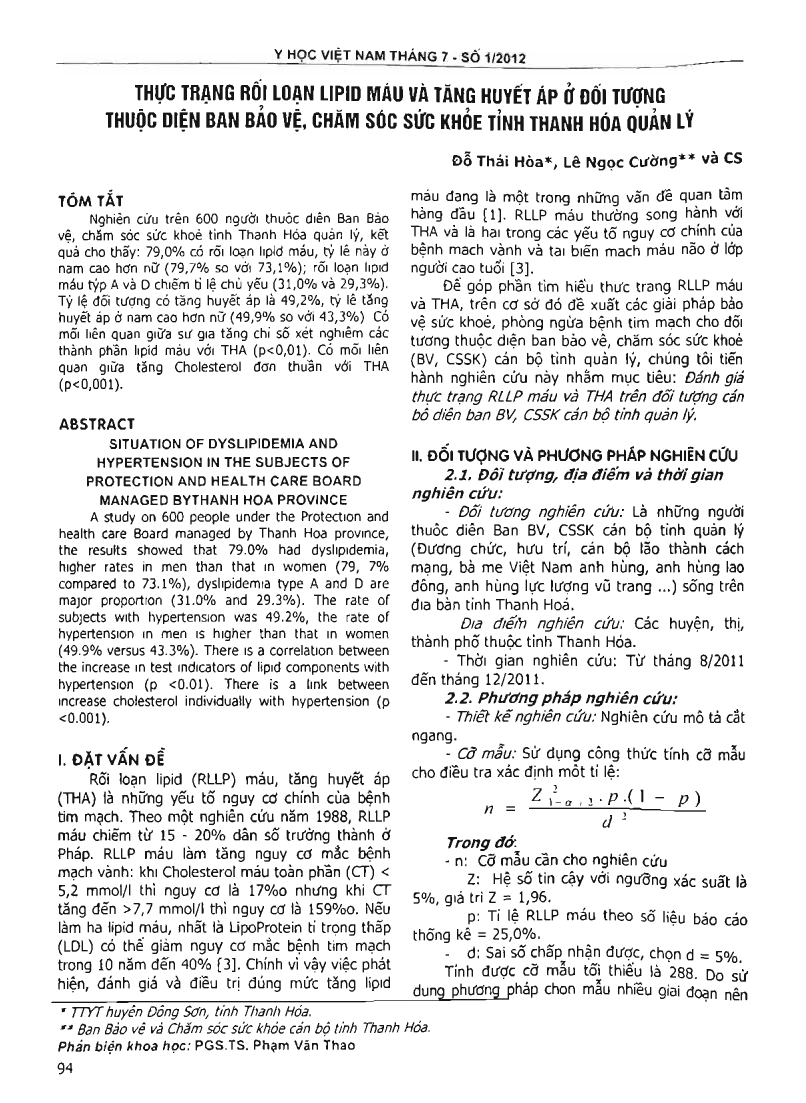 Thực trạng rối loạn Lipid máu và tăng huyết áp ở đối tượng thuộc diện ban bảo vệ, chăm sóc sức khỏe tỉnh Thanh Hóa quản lý