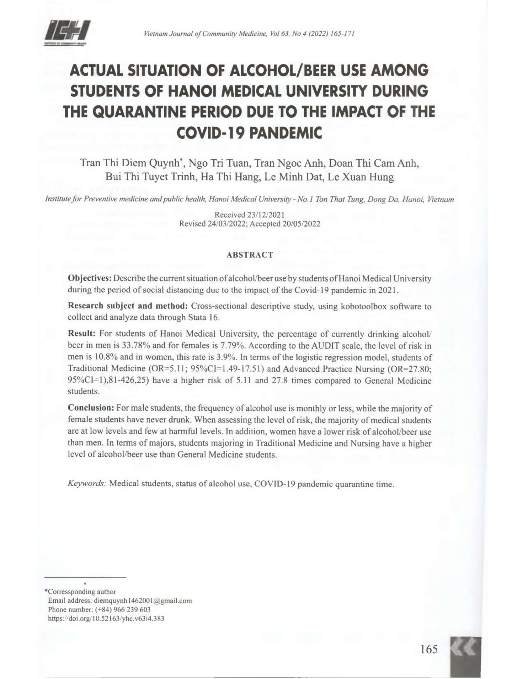 Mô tả thực trạng sử dụng rượu/bia của sinh viên trường Đại học Y Hà Nội trong thời gian giãn cách do ảnh hưởng của đại dịch Covid-19 năm 2021. Đối tượng và phương pháp nghiên cứu: Nghiên cứu mô tả cắt ngang, sử dụng phần mềm kobotoolbox thu thập số liệu và phân tích qua Stata 16. Kết quả: Đối với sinh viên Trường Đại học Y Hà Nội, tỷ lệ hiện đang uống rượu/bia ở nam là 33,78% và nữ là 7,79%. Theo thang đo AUDIT, mức nguy cơ ở nam là 10.8% và ở nữ tỷ lệ này là 3.9%. Xét về mô hình hồi quy logistic, sinh viên Y học cổ truyền (OR=5,11; 95%CI=1,49-17,51) và Điều dưỡng tiến tiến (OR=27,80; 95%CI=1,81-426,25) có mức nguy cơ cao gấp 5.11 và 27,8 lần so với sinh viên hệ Y khoa. Kết luận: Ở nam sinh viên tần suất sử dụng rượu bia là ở mức hàng tháng hoặc ít hơn, còn ở nữ thì đa phần chưa bao giờ uống. Khi đánh giá về mức nguy cơ, phần lớn sinh viên Y đều ở mức thấp và ít ở mức có hại. Ngoài ra, ở nữ có mức nguy cơ sử dụng rượu/bia thấp hơn nam. Xét về chuyên ngành các sinh viên ngành ngành Y học Cổ truyền và Điều Dưỡng có mức độ sử dụng rượu/bia cao hơn so với sinh viên Y khoa.