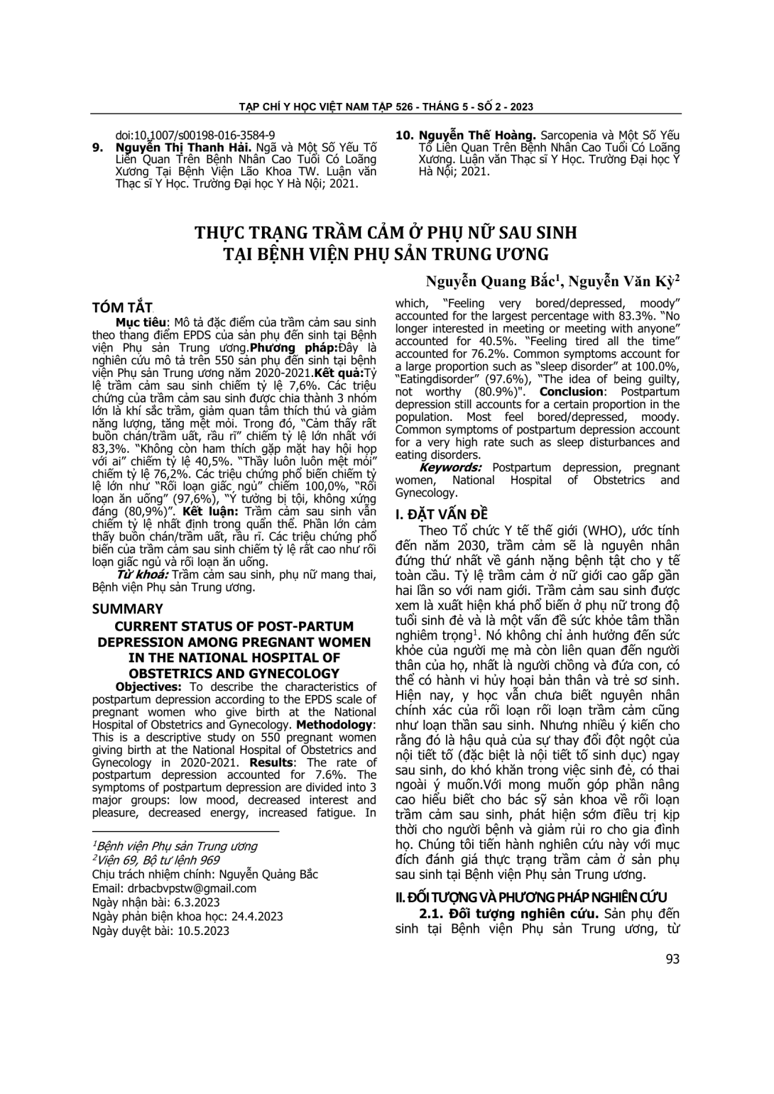 Mô tả đặc điểm của trầm cảm sau sinh theo thang điểm EPDS của sản phụ đến sinh tại Bệnh viện Phụ sản Trung ương.Phương pháp:Đây là nghiên cứu mô tả trên 550 sản phụ đến sinh tại bệnh viện Phụ sản Trung ương năm 2020-2021.Kết quả:Tỷ lệ trầm cảm sau sinh chiếm tỷ lệ 7,6%. Các triệu chứng của trầm cảm sau sinh được chia thành 3 nhóm lớn là khí sắc trầm, giảm quan tâm thích thú và giảm năng lượng, tăng mệt mỏi. Trong đó, “Cảm thấy rất buồn chán/trầm uất, rầu rĩ” chiếm tỷ lệ lớn nhất với 83,3%. “Không còn ham thích gặp mặt hay hội họp với ai” chiếm tỷ lệ 40,5%. “Thầy luôn luôn mệt mỏi” chiếm tỷ lệ 76,2%. Các triệu chứng phổ biến chiếm tỷ lệ lớn như “Rối loạn giấc ngủ” chiếm 100,0%, “Rối loạn ăn uống” (97,6%), “Ý tưởng bị tội, không xứng đáng (80,9%)”. Kết luận: Trầm cảm sau sinh vẫn chiếm tỷ lệ nhất định trong quẩn thể. Phần lớn cảm thấy buồn chán/trầm uất, rầu rĩ. Các triệu chứng phổ biến của trầm cảm sau sinh chiếm tỷ lệ rất cao như rối loạn giấc ngủ và rối loạn ăn uống.